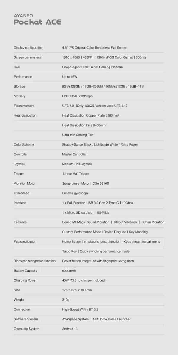 根据 Ayaneo 的说法,所有 Pocket Ace SKU 都将配备 LPDDR5X 内存,时钟频率为 8533 Mbps。相反,除 128 GB 存储版本外,其他版本均采用 UFS 4.0 内存。相比之下,128 GB 版本的 UFS 3.1 闪存速度较慢。无论如何,Ayaneo 为所有机型配备了 4.5 英寸 IPS 显示屏,分辨率为 1,620 x 1,080 像素,峰值亮度为 550 尼特。
