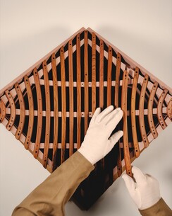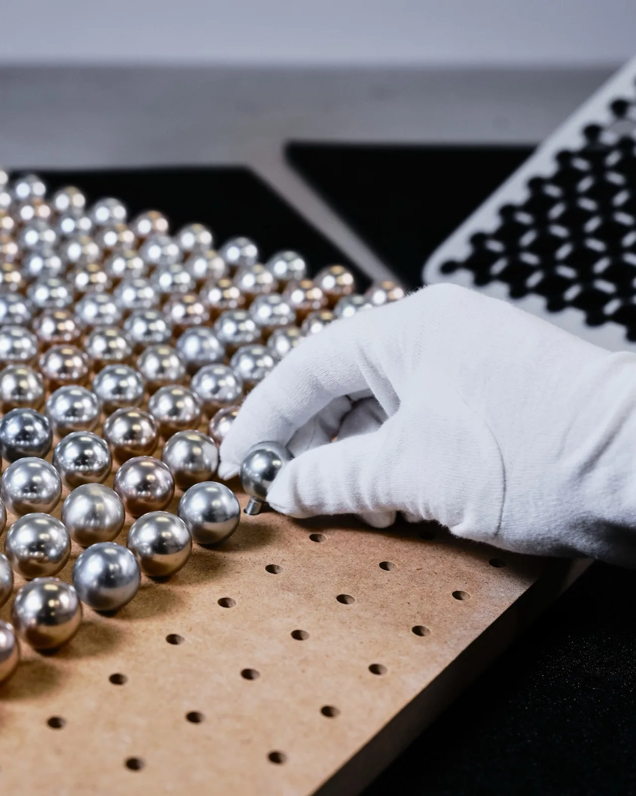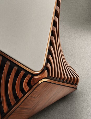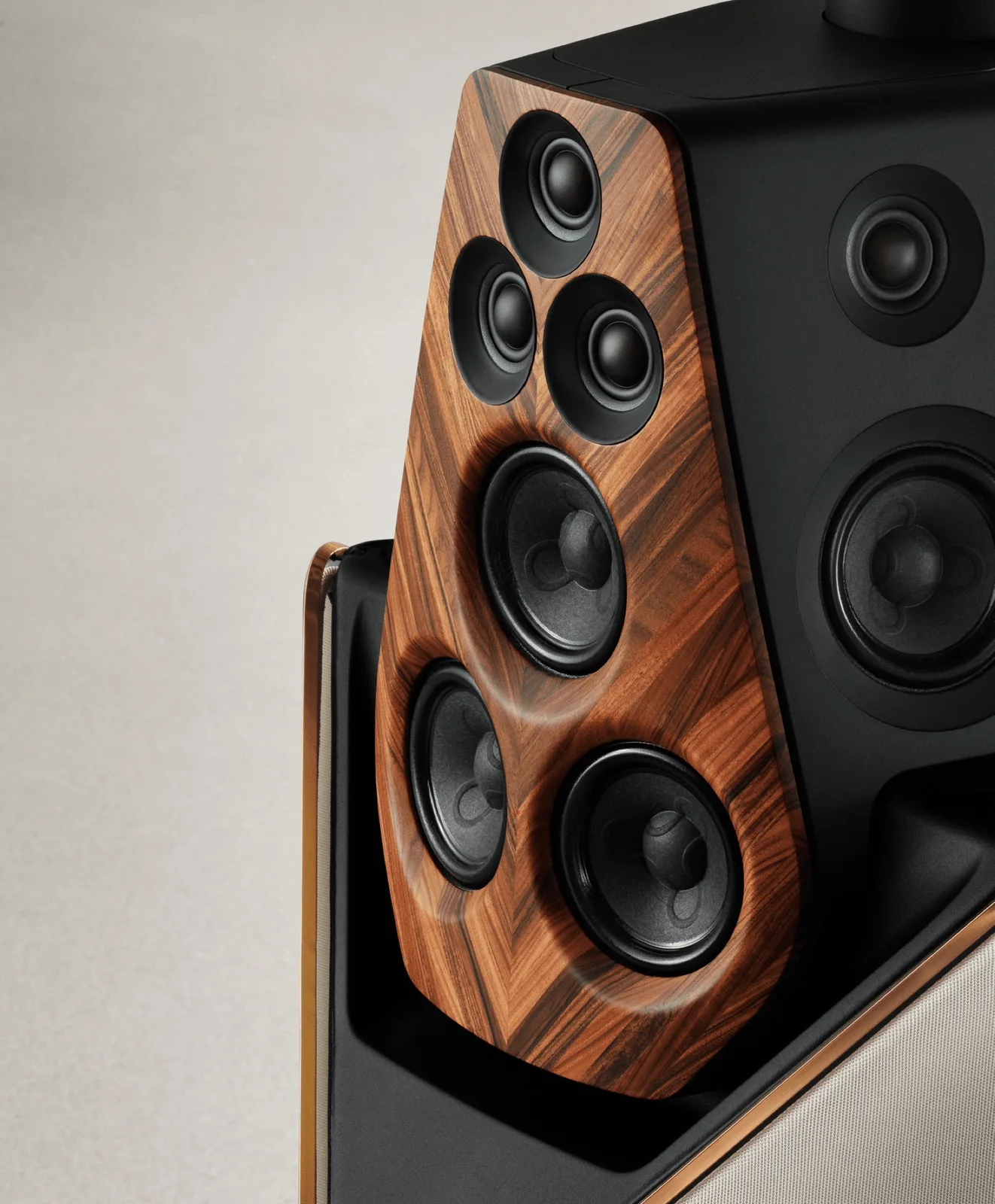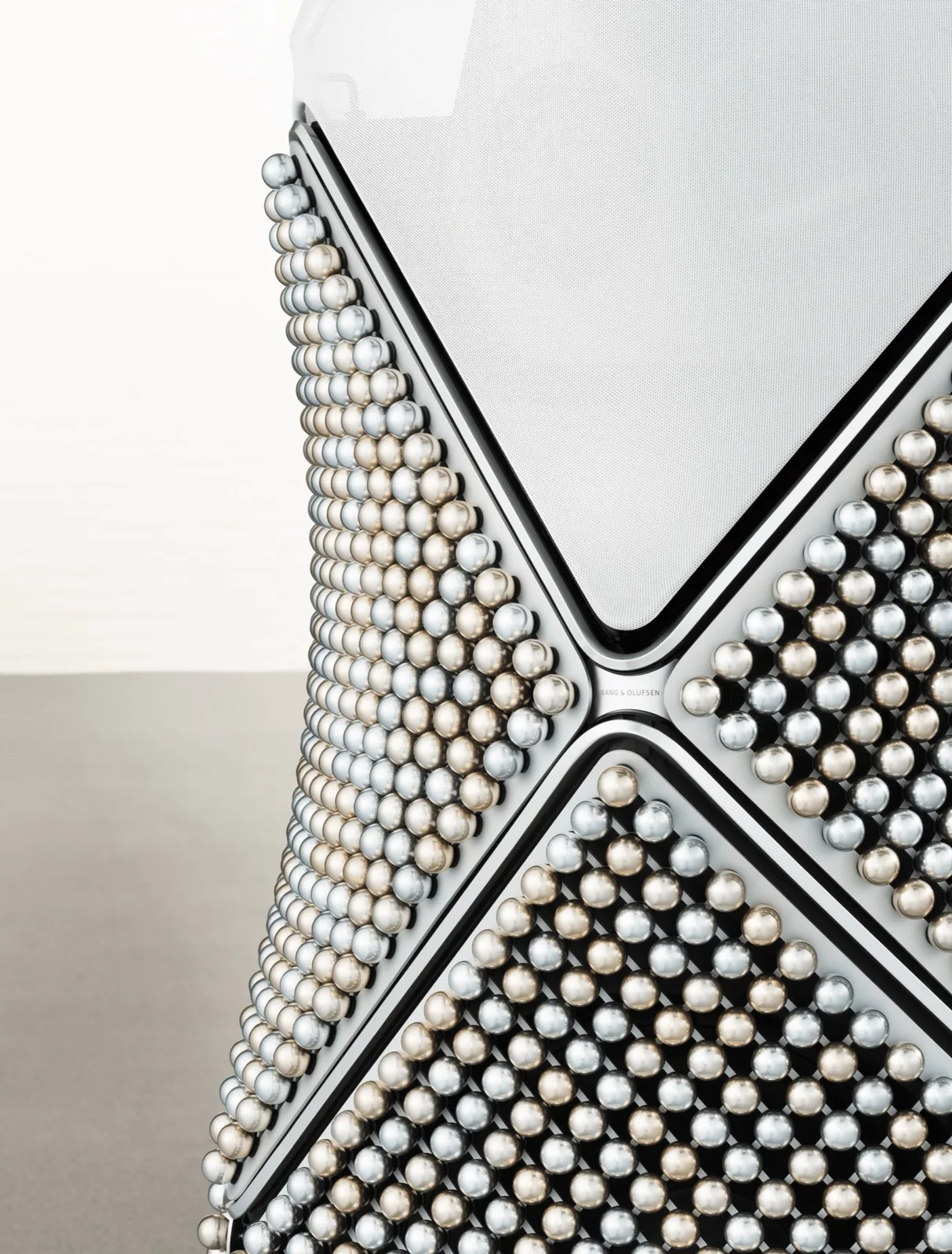 Zenith 版则配备了六块面板,每块面板上都有 289 个铝制球体,球体以七种不同的色调装饰,灵感均来自珍珠。这样做的目的是使扬声器表面闪闪发光,与入射光线产生三维互动。在技术上,Beolab 90 保持不变。每个扬声器都有一个 13 英寸低音扬声器、三个 10 英寸低音扬声器、七个 4.5 英寸中音扬声器和七个 1 英寸高音扬声器。