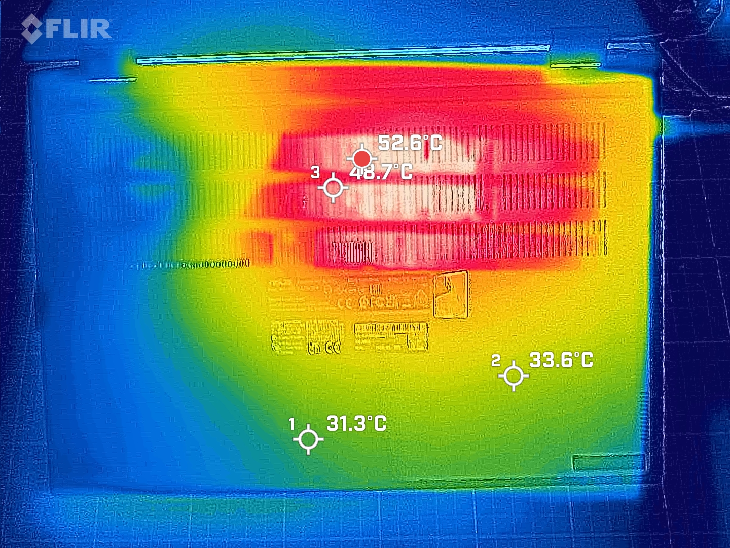 新款 ExpertBook B5 Flip 的温度比前代产品低得多。 的温度要低得多。旧机型的顶部和底部平均温度为 34°C,而新机型的温度要低得多,我们测得顶部温度为 28.8°C,底部温度为 30.7°C。屏幕正前方的热点也更低了。旧机型在这一区域测得的温度超过 45°C,而新机的峰值为 40°C。在闲置模式下,其温度很低,不会令人讨厌。