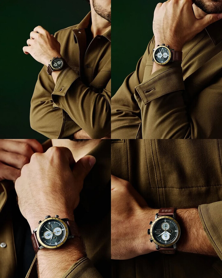 这款手表采用 43.6 毫米不锈钢表壳,以深色为基调,搭配棕色皮革表带,表耳附近有明显的缝线。整体外观更接近飞行员风格的计时码表,但在表盘中融入了该系列的多种参考元素。乍一看,表盘似乎是灰色的太阳纹表面,但仔细观察就会发现主题小表盘。上层小表盘使用了 Mudhorn 符号,指的是 Din Djarin 在剧中击败的生物,而下层则显示了曼达洛人头盔的图案。设计中还加入了小巧的格鲁古耳朵造型。这些细节与计时码表的布局天衣无缝,而非喧宾夺主。