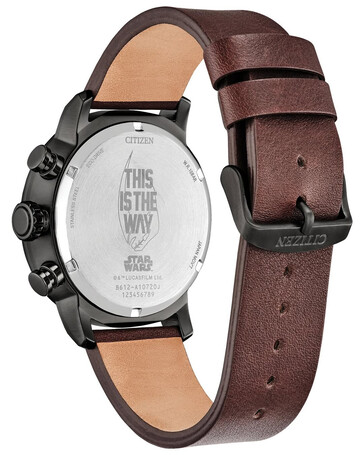 金色测速表圈环绕表盘,也为原本深色的表壳增加了对比度。这款手表还使用了夜光指针和时标,在宣传图片中可以看到,在光线不足的情况下,指针和时标会发出微光。内部搭载西铁城B612 Eco-Drive 精密计时机芯。该机芯由光驱动。该机芯支持标准的计时功能,并在 3 点钟位置设有日期显示。表背还镌刻有 "This Is The Way"(这就是路)的字样,这是《星球大战》 宇宙中与曼陀罗文化相关的最具标志性的句子之一。在镌刻的同时,还出现了其他的 Mudhorn 形象。