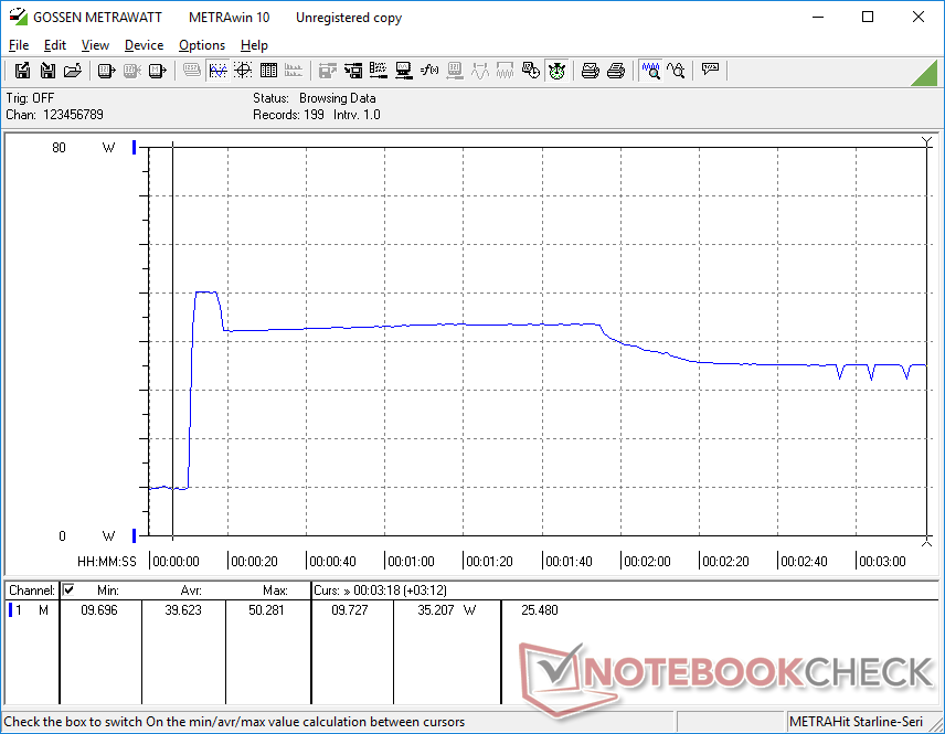 在同时运行Prime95和FurMark时,我们能够从小型(约9.5 x 4.1 x 6厘米)47.5瓦的交流适配器中记录到50瓦的临时最大耗电。