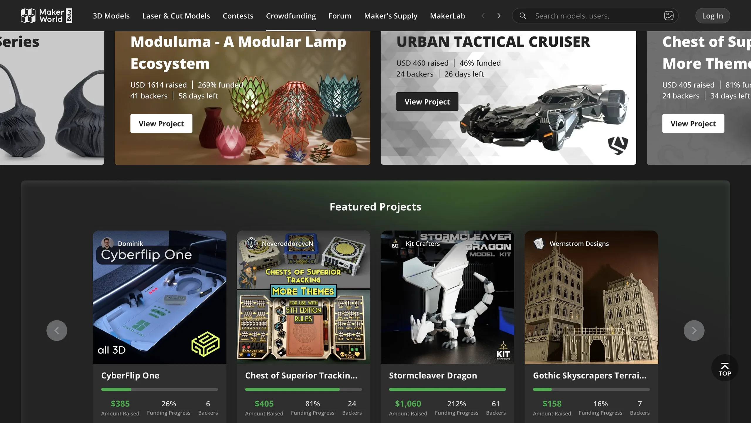 该平台本质上就像是 3D 打印社区的 Kickstarter。创作者可以提交一份详细的提案,描述他们的想法,并通过渲染、定义目标和30天、45天或60天的时间期限以及分级奖励(如独家STL文件、教程、DIY工具包和定制3D打印)将其形象化。活动上线后,他们还可以分享更新信息并回复感兴趣用户的评论。
