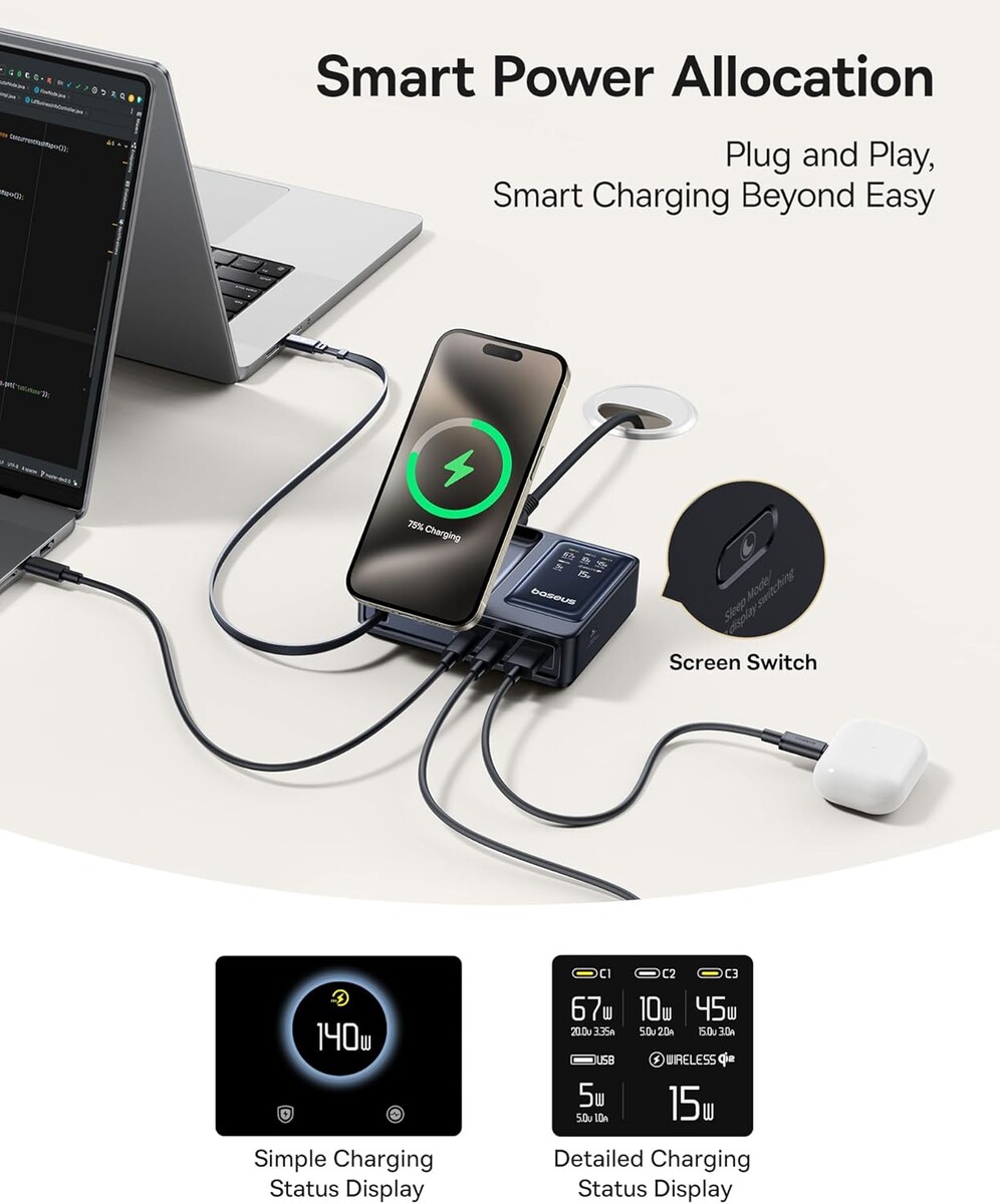 Baseus 声称这是世界上第一款带有可伸缩线缆的台式充电器。内置的 80 厘米(2.6 英尺)Type-C 线缆可提供高达 100W 的功率,并可平滑地伸缩到设备中,从而将桌面的杂乱程度降到最低。除此之外,还有一个 USB-A 插座和两个 Type-C 插座,其中一个可以单独提供 140 瓦的功率。