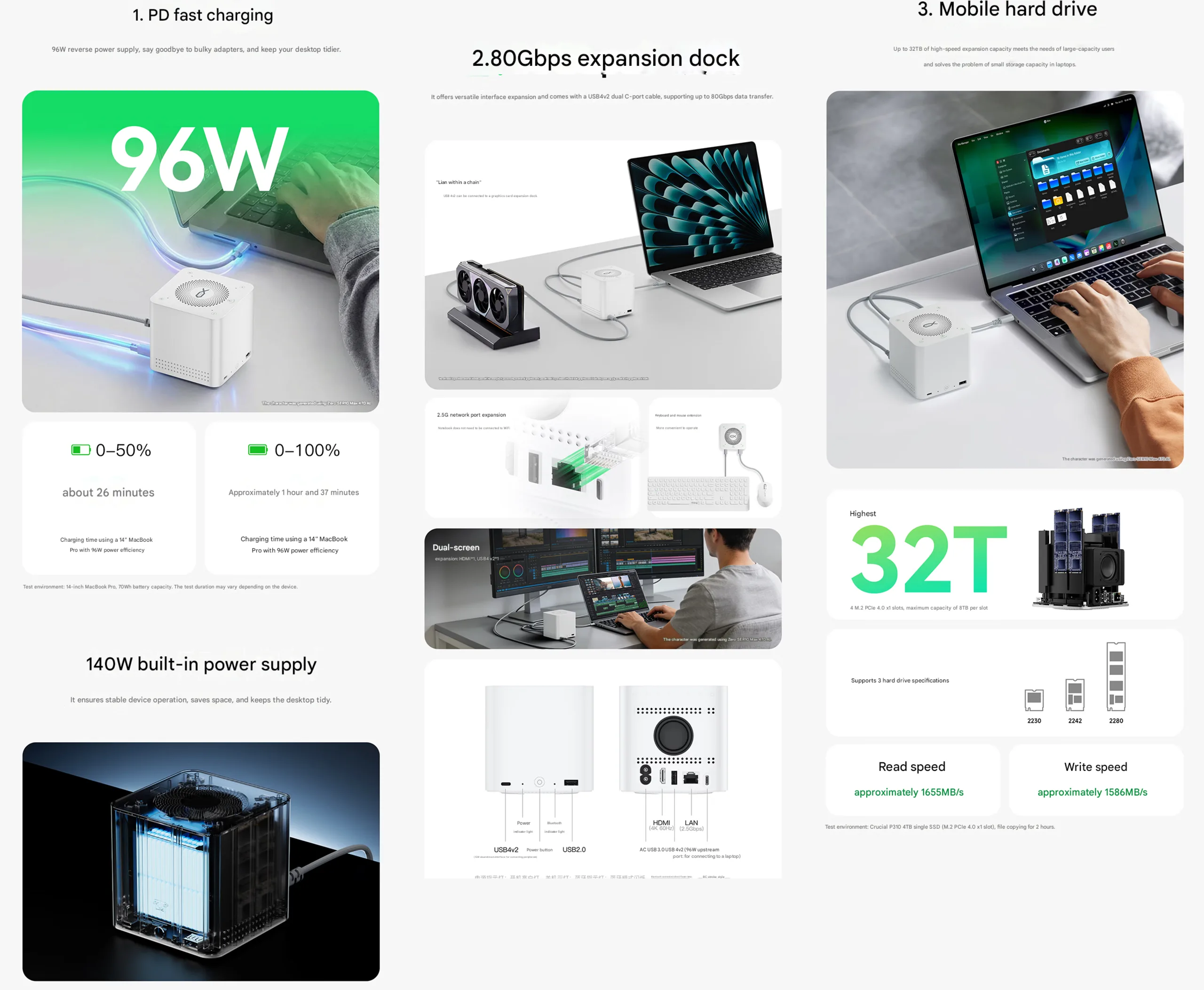 该底座的另一大亮点是四个 M.2 插槽,总共可容纳 32TB 的存储空间。Beelink 指出,这些插槽是 PCIe 4.0 x1 插槽,并声称该扩展坞的读取速度可达 1655MB/s,写入速度可达 1586MB/s。