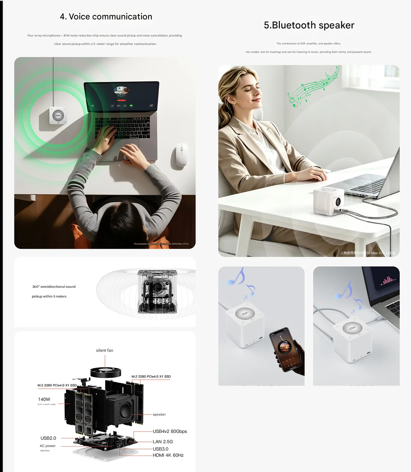 底座还具有蓝牙连接功能,用于内置扬声器。Beelink 称,内置 DSP 和 放大器以确保会议和音乐播放时的良好音质。在有线模式下也可以播放音频,但在这种情况下,音频是通过连接的电脑播放的。它甚至还有一个风扇来保持内部冷却。
