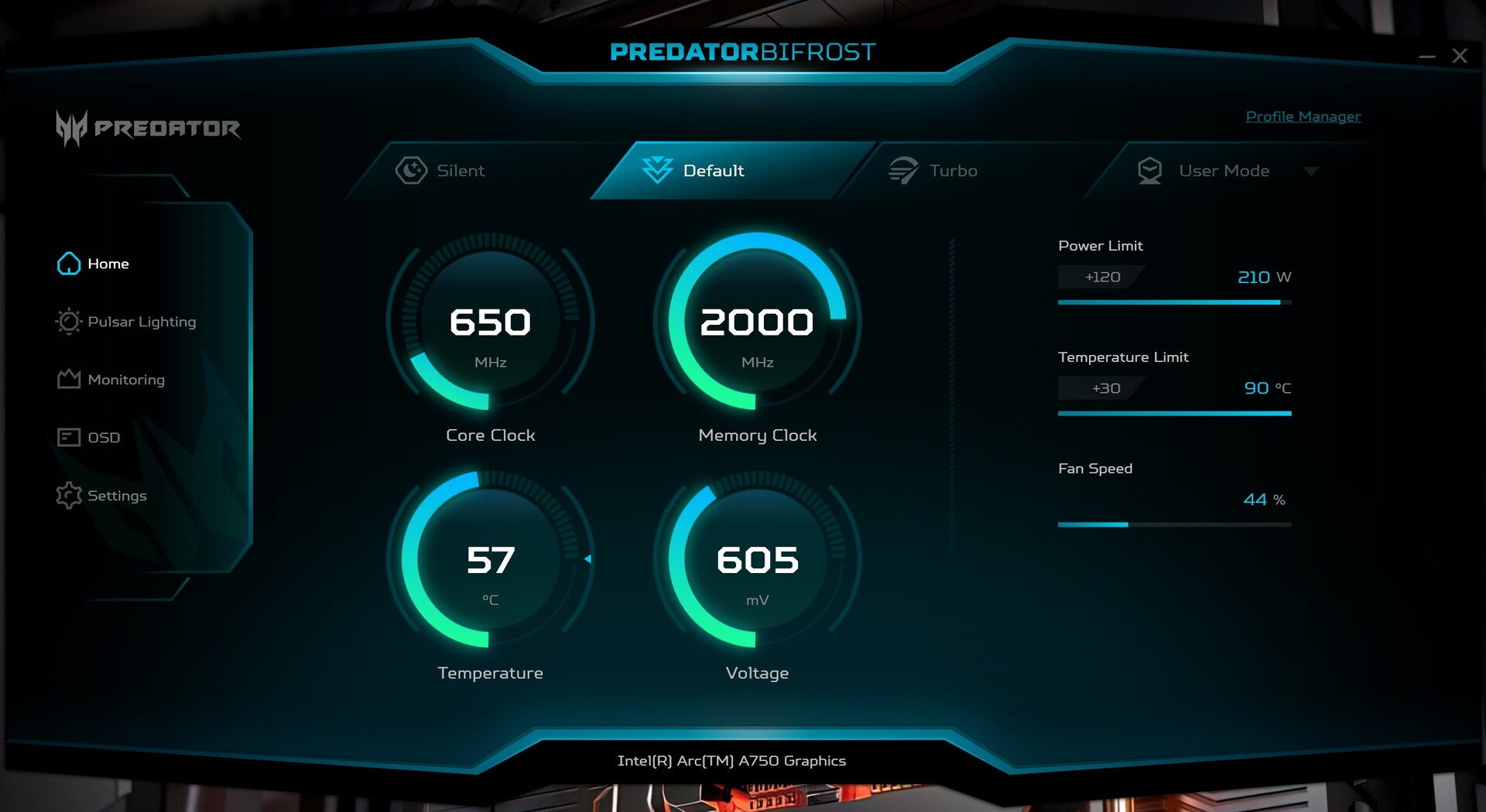 宏碁掠夺者 BiFrost Arc A750 OC 的图形芯片基本时钟频率为 2,050 MHz。在玩游戏时,我们经常注意到频率高达 2,450 MHz。显存时钟频率为 2,000 MHz,显存带宽为 512 GB/s。这比英特尔 Arc A770 略低,但仍比其直接竞争对手如AMD Radeon RX 7700 XT或NvidiaGeForce RTX 4060 Ti.我们的测试样本显示功耗为 210 瓦--这是在正常使用的情况下。另外,你还可以将宏碁掠夺者 BiFrost Arc A750 OC 设置为静音模式(160 瓦)或涡轮增压模式(216 瓦)。不过,我们使用默认模式(210 瓦)进行了所有测试。