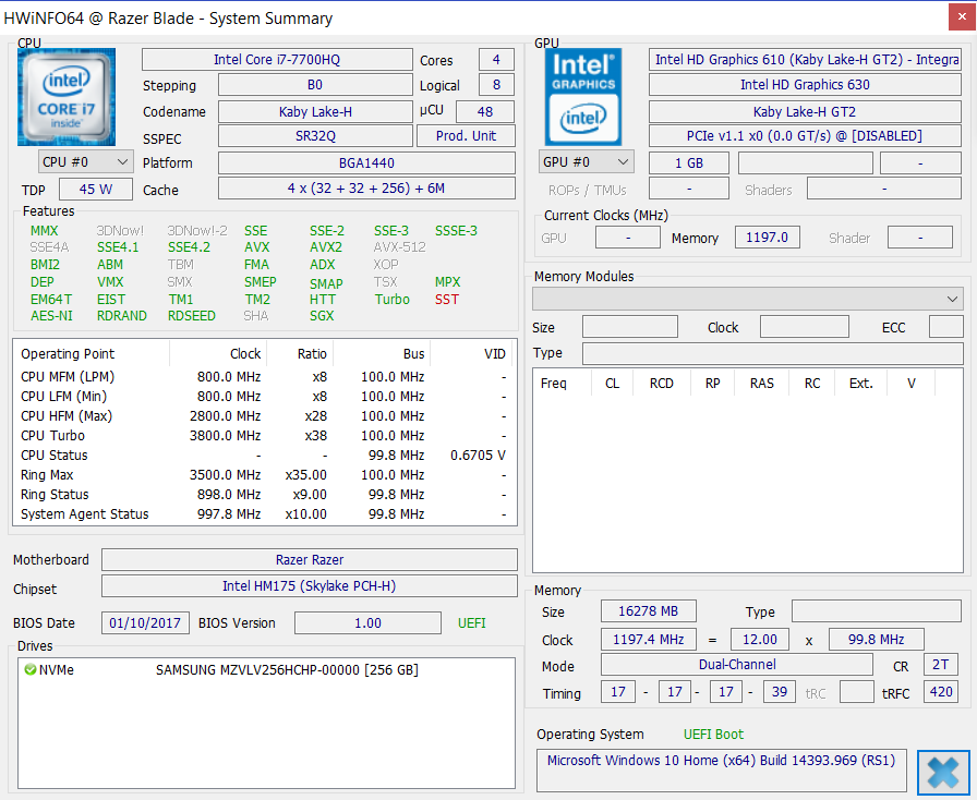 | Razer Blade (2017) i7-7700HQ, GeForce GTX 1060 Mobile, Samsung PM951 NVMe MZVLV256, IPS, 1920x1080, 14" | Razer Blade (2016) FHD 6700HQ, GeForce GTX 1060 Mobile, , IPS, 1920x1080, 14" | Razer Blade (2016) 6700HQ, GeForce GTX 1060 Mobile, Samsung PM951 NVMe MZVLV512, IGZO, 3200x1800, 14" | Gigabyte Aero 14 i7-7700HQ, GeForce GTX 1060 Mobile, LiteOn CX2-8B256, IPS, 2560x1440, 14" | Alienware 13 R3 i7-7700HQ, GeForce GTX 1060 Mobile, Toshiba NVMe THNSN5256GPUK, OLED, 2560x1440, 13.3" | Apple MacBook Pro 13 2016 (2.9 GHz) 6267U, Iris Graphics 550, Apple SSD AP0256, , 2560x1600, 13.3" | |