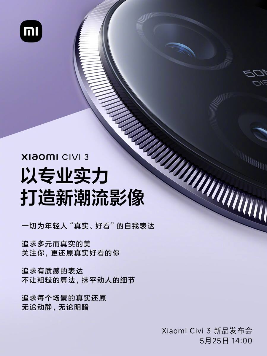 在5月25日CIVI 3发布之前,小米已经透露了更多关于该设备的细节。简而言之,该公司已经 已经确认CIVI 3将是Dimensity 8200 Ultra的展示,这是一个未发布的联发科芯片组。随后、 它概述了该设备的四种推出的颜色,其中三种有双色的表面处理。