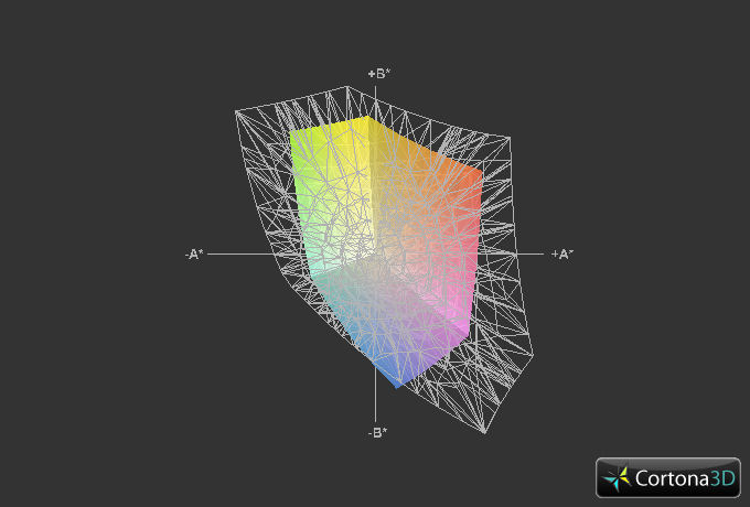 The contrast of 500:1 and black value of 0.44 cd/m² are within a very acceptable range. The rates from the Vostro 3460 (159:1; 0.97 cd/m²) and Asus' B43E (206:1; 1.03 cd/m²) cannot compete with that. The CR41's screen can neither reproduce the AdobeRGB nor sRGB color spectrum. We measured the screen using X-rite i1 Pro 2 before calibration and ascertained strong DeltaE 2000 deviations. The space between the single RGB colors is very large due to the uncovered sRGB color gamut. A blue cast is visible in state of delivery. Both characteristics are typical for low-budget screens.