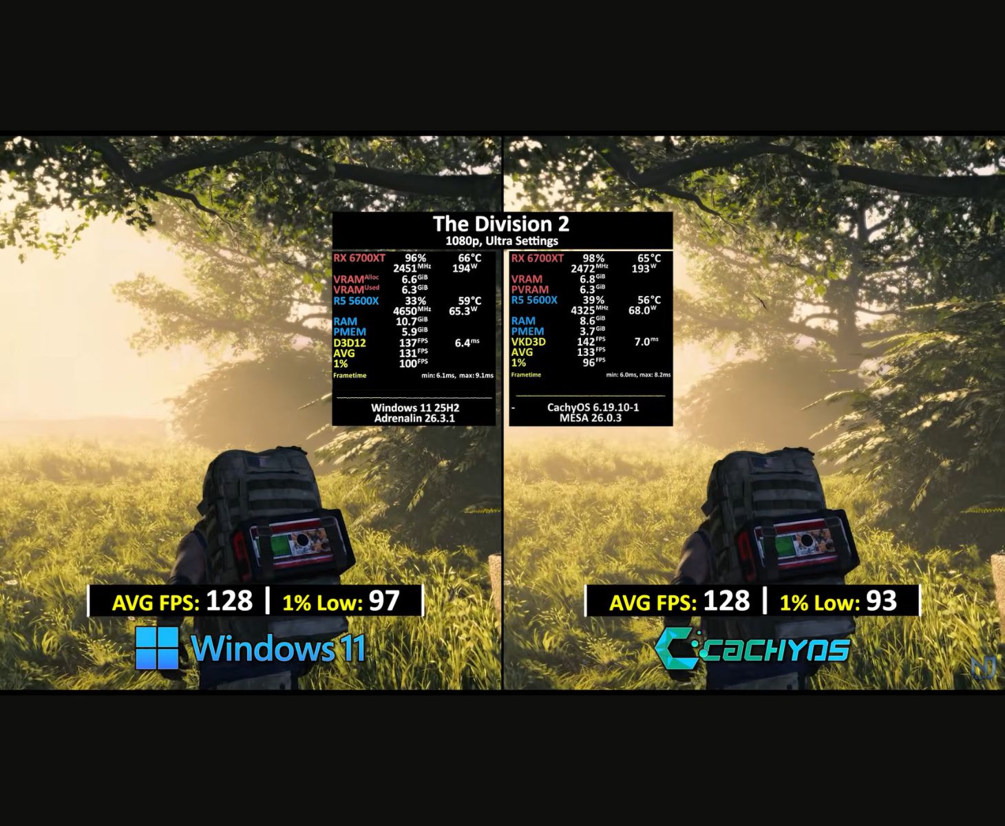 不过,Windows 11 在 1080p 超高清设置下使用 FSR 3 Native 运行《The First Descendant》 等游戏时缩小了差距,它能以 63 FPS 的速度运行游戏,而 CachyOS 只能达到 54 FPS。在 1080p Ultra 设置下运行《组织 2》 时,Windows 11 和 CachyOS 都达到了 128 FPS,其中 Windows 11 的 1%低帧率为 97 FPS,而 CachyOS 为 93 FPS。