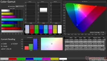 由于对比度低至 520:1,该面板的性能明显较差,在灰度和 ColorChecker 测试中都出现了明显偏差。2D sRGB 覆盖率也不尽如人意,仅为 57.5% 左右。