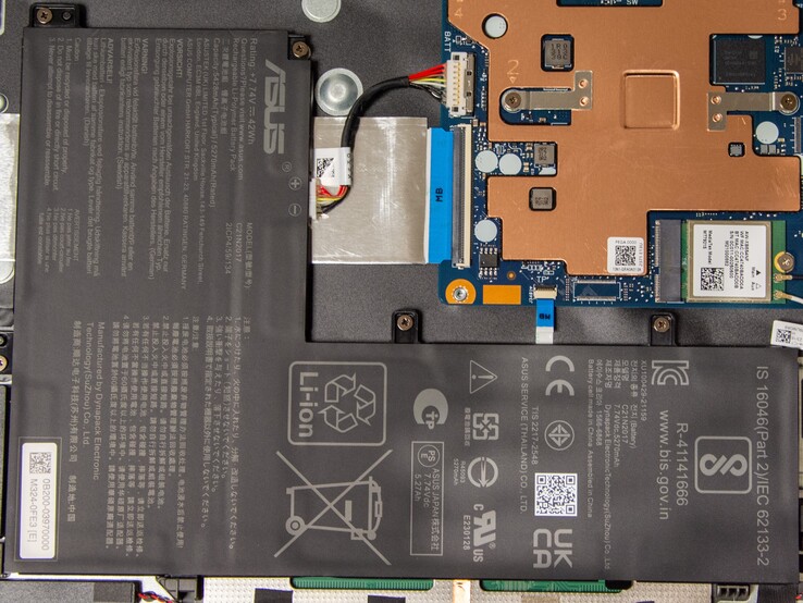 端口分布在两侧,但并不均匀。右侧只有一个 USB-C 端口和一个 LED。在左侧,华硕为 USB-C 版本配备了另一个 USB-C 端口、一个 USB-A 端口、符合 USB 3.2 Gen 1 标准的 USB 端口(提供电源传输)和 DisplayPort。此外,还有一个防盗装置(Kensington Lock 插槽)、一个 3.5 毫米插孔连接和一个 microSD 卡插槽。正面和背面没有连接。
