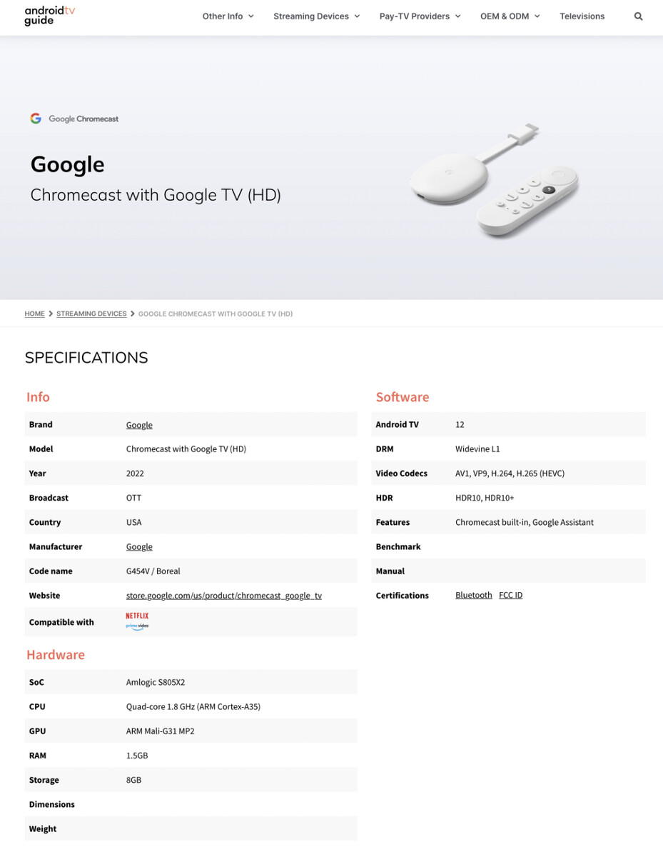 正如下面的截图所示,带有谷歌电视(高清)的Chromecast依赖于Amlogic S805X2芯片组,它包含四个ARM Cortex-A35 CPU内核,能够以1.8 GHz的速度运行。此外,该SoC具有Mali-G31 MP2,并辅以1.5GB的内存和8GB的存储空间。不出所料,带有谷歌电视(高清)的Chromecast运行Android TV 12,并配有Widevine L1认证,可从亚马逊Prime Video和Netflix等流媒体内容。此外,谷歌还捆绑了一个支持谷歌助理的遥控器,有专门的Netflix和YouTube快捷键。