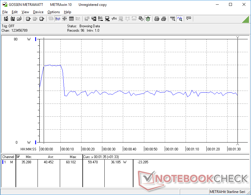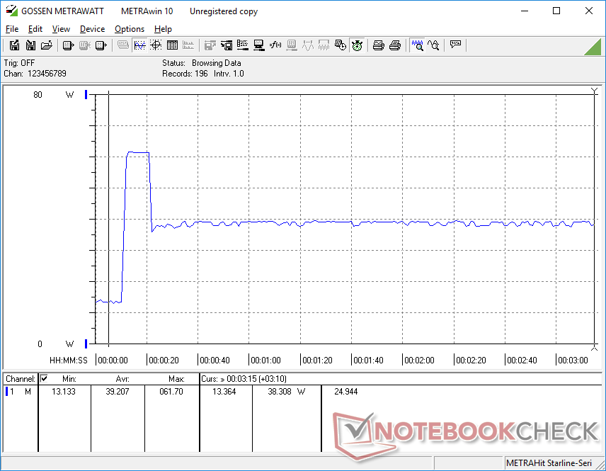 我们能够从小型(约6.4 x 6.4 x 3.0厘米)的65瓦交流适配器中测出40.5瓦的最大消耗。如下图所示,由于系统的Turbo Boost有限,这个比率是暂时的。