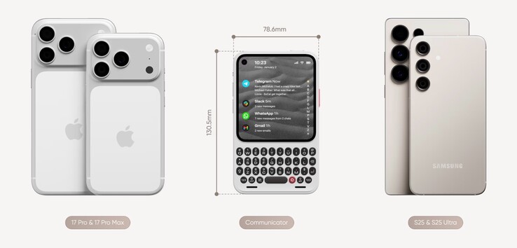 Clicks Communicator 是一款结构紧凑的中端智能手机,它配备了Android 16,并将更新至Android 20。在近乎正方形的 4 英寸触摸屏下面是一个键盘,它是触摸感应式的,因此也可作为触控板使用,而空格键上则有一个指纹传感器。