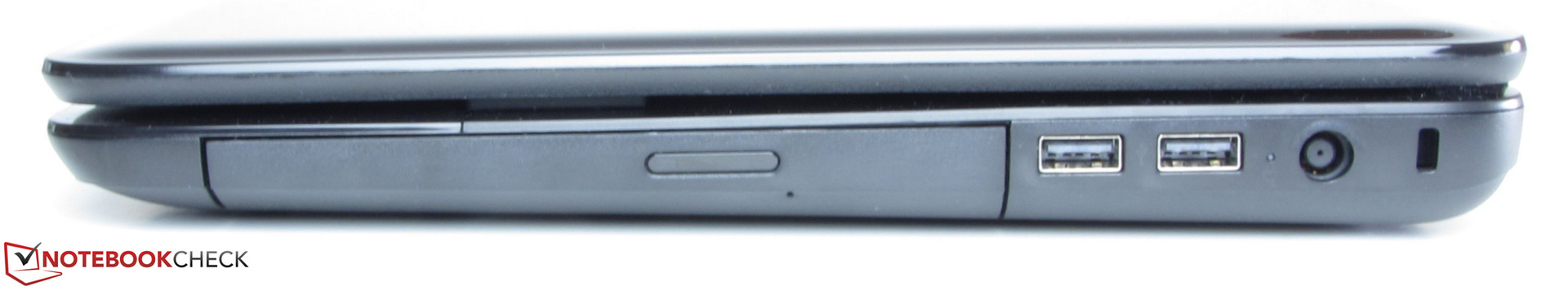 All of the three computers which we compare the Hewlett Packard with come with the usual equipment. However, the CQ58-350sg is a little bit behind its competitors. The HP computer is the only one that offers a 10/100 Mbits/s Ethernet port. The competition offers Gigabit-Ethernet. Additionally, the Samsung notebook is the only one that contains USB 3.0 ports. Thus the CQ58-350sg is a little bit outdated. Some of the ports of the HP computer are poorly positioned and set in the front area of the left side.