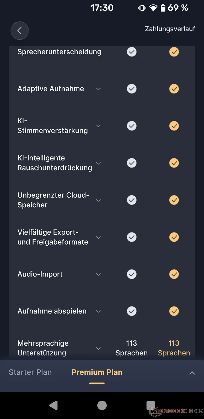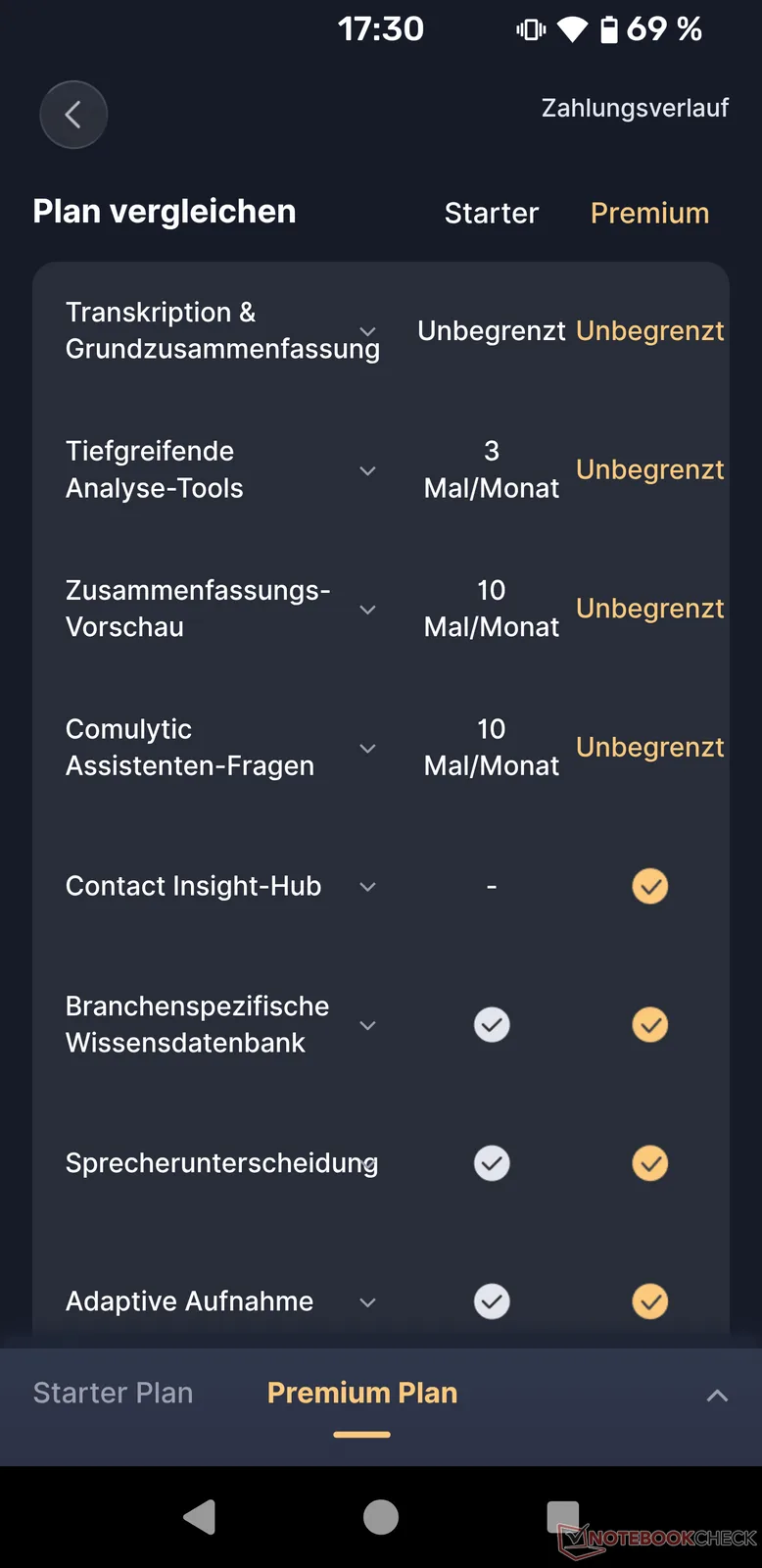 Comulytic Note Pro 和 Plaud Note 这两款人工智能录音机在设计上非常相似:尺寸、电池容量等都完全相同。Plaud 有一个必须按下才能开始录音的物理按钮,而 Comulytic 则有一个触摸按钮。最显著的区别在于付费模式:Plaud Note 用户必须在每月 300 分钟后按分钟付费才能收到转录内容,而 Comulytic Note Pro 用户则可以随心所欲地进行转录。不过,这里也有一种名为 "高级 "的订阅模式。高级版 "允许您在对话中添加重要内容:当您输入术语时,这些术语会在摘要中以黄色高亮显示,这使得使用更加方便,但对于许多用户来说,这可能并不是一项必备功能。