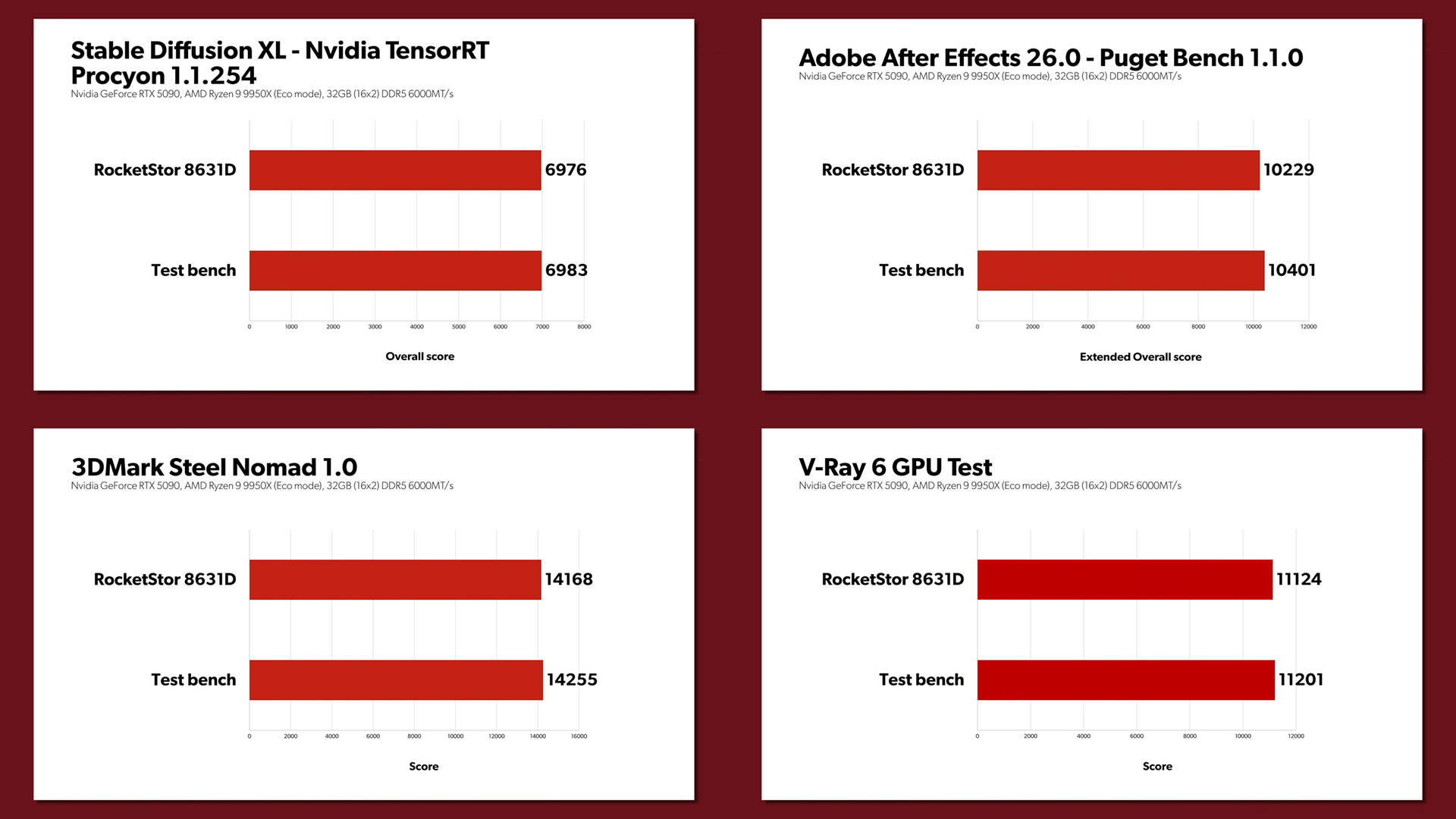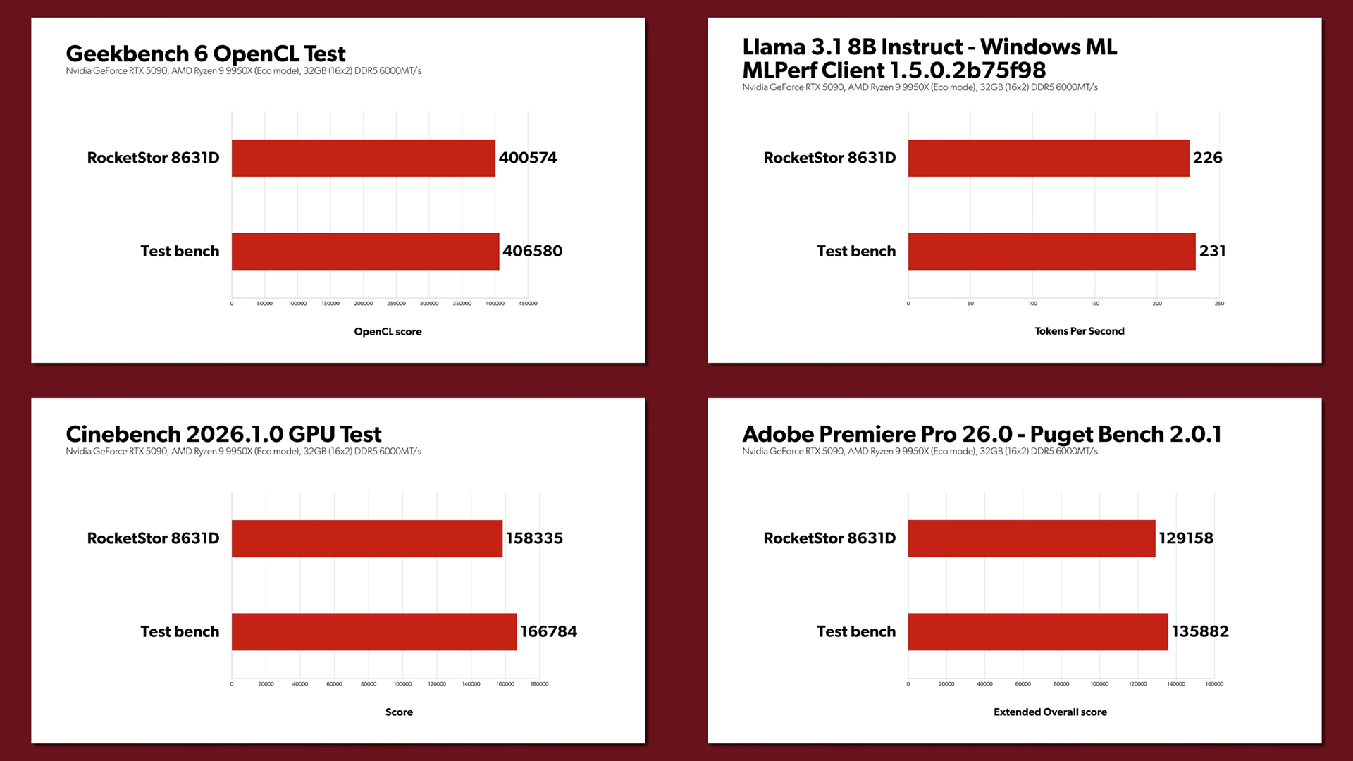PCWorld 使用台式机 Nvidia RTX 5090 对 CopprLink 设置进行了测试。该设置依赖于 HighPoint 的 RocketStor 8631D,而 RocketStor 8631D 依赖于 CopprLink 布线。不过,与普通的 eGPU 设置不同,它不能直接连接到台式机、笔记本电脑或游戏手持设备。