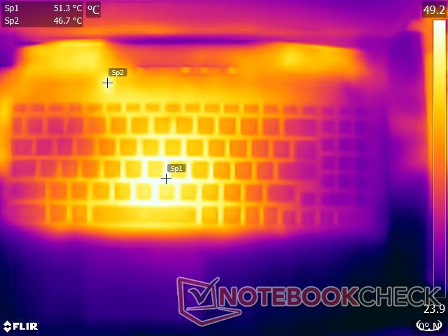 (-) The maximum temperature on the upper side is 48.4 °C / 119 F, compared to the average of 40.4 °C / 105 F, ranging from 21.2 to 68.8 °C for the class Gaming.