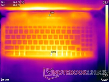 (+) The palmrests and touchpad are reaching skin temperature as a maximum (32.8 °C / 91 F) and are therefore not hot.