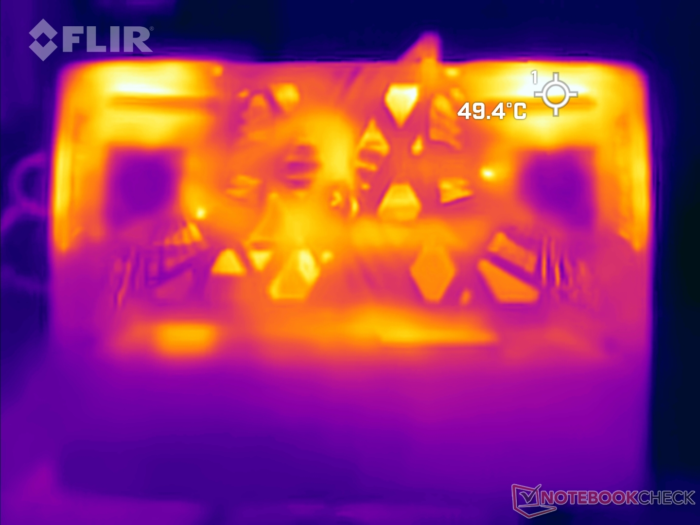 在极致性能模式下,表面温度上侧可达 45 °C,下侧接近 49 °C。