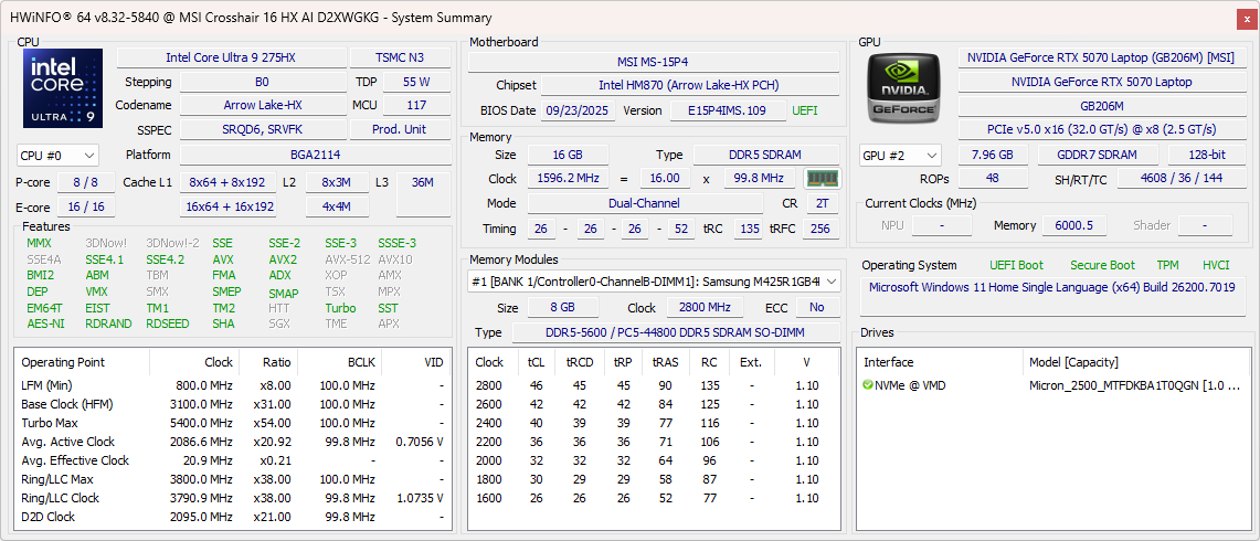 我们的 Crosshair 16 HX AI 配备了 Core Ultra 9 275HX、115 W RTX 5070 Laptop GPU、16 GB DDR5-5600 内存、1 TB NVMe SSD 和 QHD+ 240 Hz IPS 级显示屏。 Crosshair 16 HX D14机箱。