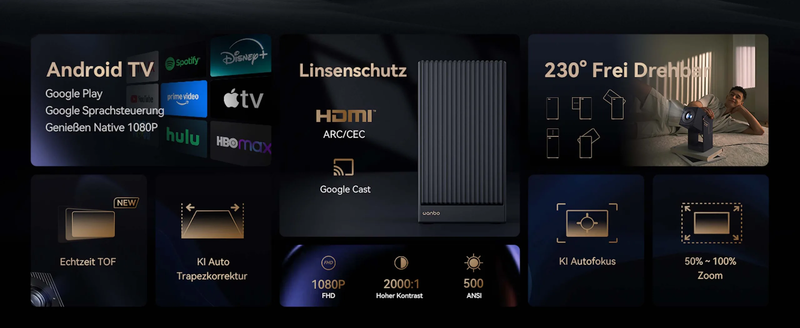 这款万博投影机还支持 WiFi 和蓝牙连接。操作系统为Android TV 11.0,支持媒体播放和智能家居控制。它还内置了一个 8 瓦扬声器,可通过耳机插孔连接外部音响系统或扬声器。最后还有一个 HDMI 端口和一个 USB Type-A 端口,用于连接外部存储设备以显示图片或播放视频文件。