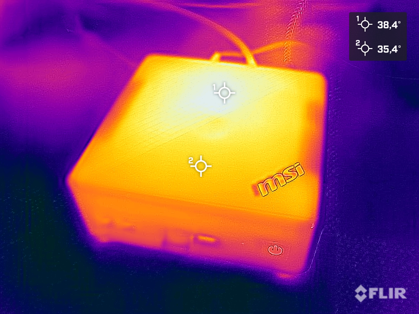 一台办公电脑应该是安静的,高于一切。微星Cubi 5 M10正好可以做到这一点。当空转时,我们测量了30.91 dB(A),这只比在完全安静的房间里(30.5 dB(A))多一点。然而,当我们单独运行Prime95作为压力测试时,明显较高的噪音负荷是明显的。在这里,SoC可以使用其所有的功率,这意味着由于热量的增加,冷却装置也必须更努力地工作。如果同时运行Prime95和FurMark两个应用程序,SoC就不能再使用全部性能,因为CPU和iGPU必须分享15瓦的TDP。在32 dB(A)的情况下,Cubi 5 10M的噪音明显降低,尽管最高35 dB(A)也不被认为是令人讨厌的。风扇是温和的上下调节,不产生任何高频噪音。