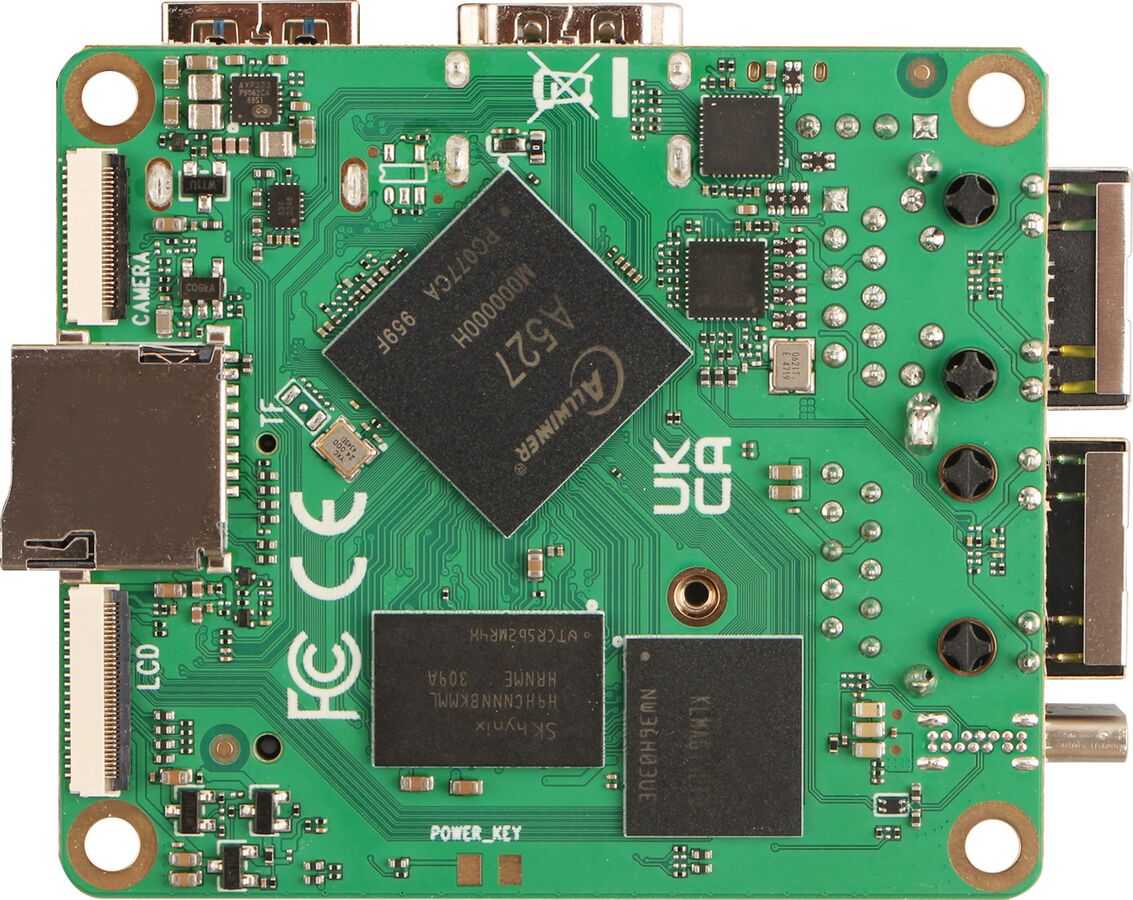 Cubie A5E 可配置 1、2 或 4 GB LPDDR4 内存,但除了用于引导加载程序的 SPI 闪存芯片外,没有任何内部存储。按照惯例,用户可以添加存储卡或安装 NVMe M.2 2230 固态硬盘。在视频输出方面,该设备提供一个 HDMI 2.0a 端口和一个 MIPI FPC 接口。摄像头不仅可以通过 USB(消费类产品的典型连接方式)连接,还可以使用 MIPI CSI 接口连接。两个千兆以太网端口可用于联网,其中一个端口支持以太网供电(PoE)。该设备配备了 Wi-Fi 6 和蓝牙 5.3,并有一个 USB 3.0 端口。