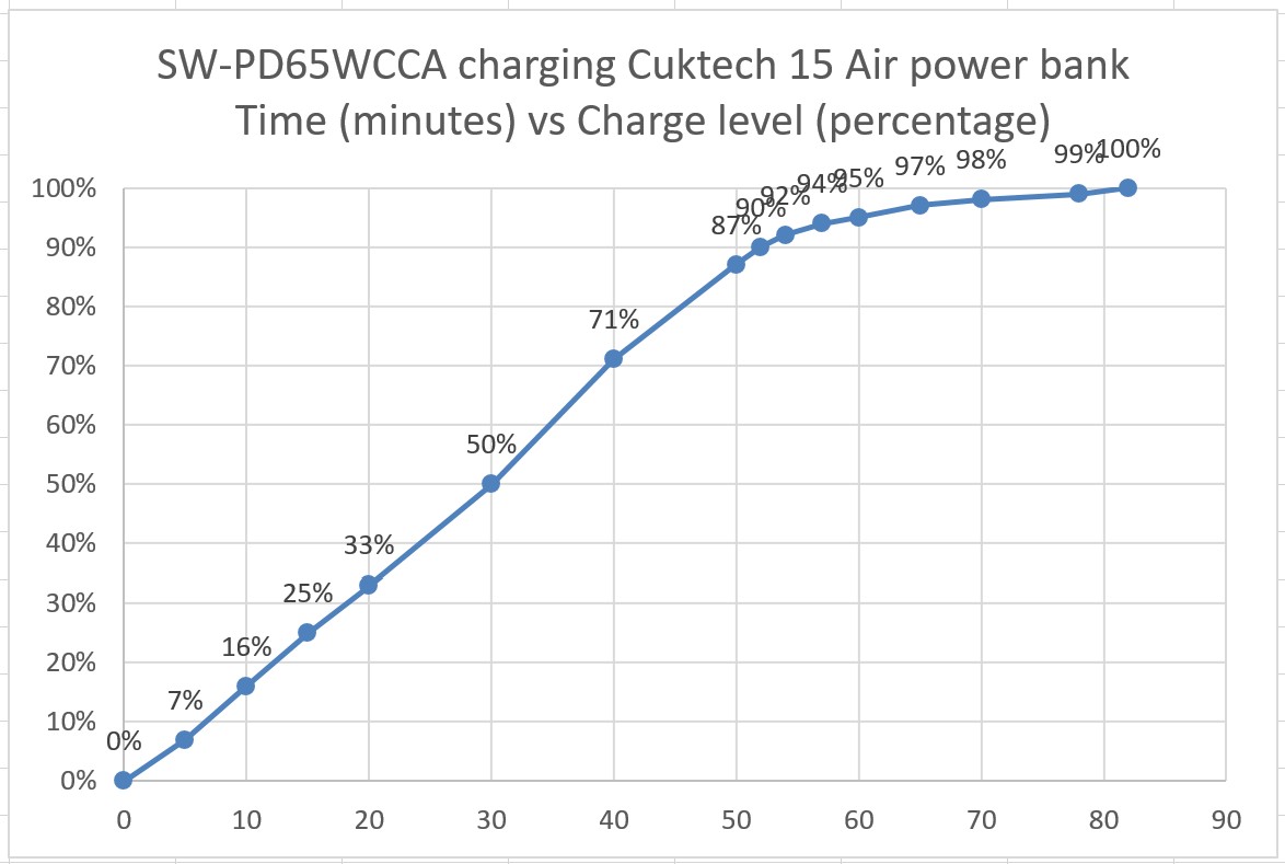 Cuktech 15 Air 电源箱(57.75 瓦时)与 Cuktech 10 Ultra(USB-C 最大输出功率为 100 瓦)和 SW-PD65WCCA(USB-C 最大输出功率为 65 瓦)相比,在使用附带的 6A USB-C 连接线时,Cuktech 10 Ultra(USB-C 最大输出功率为 100 瓦)的充满电速度稍快,大约相差 5 分钟。充电速度是非线性的,因为大多数锂离子电池从 0% 到 80% 的充电速度较快,然后为了安全起见,充电速度会减慢,直到 100%。