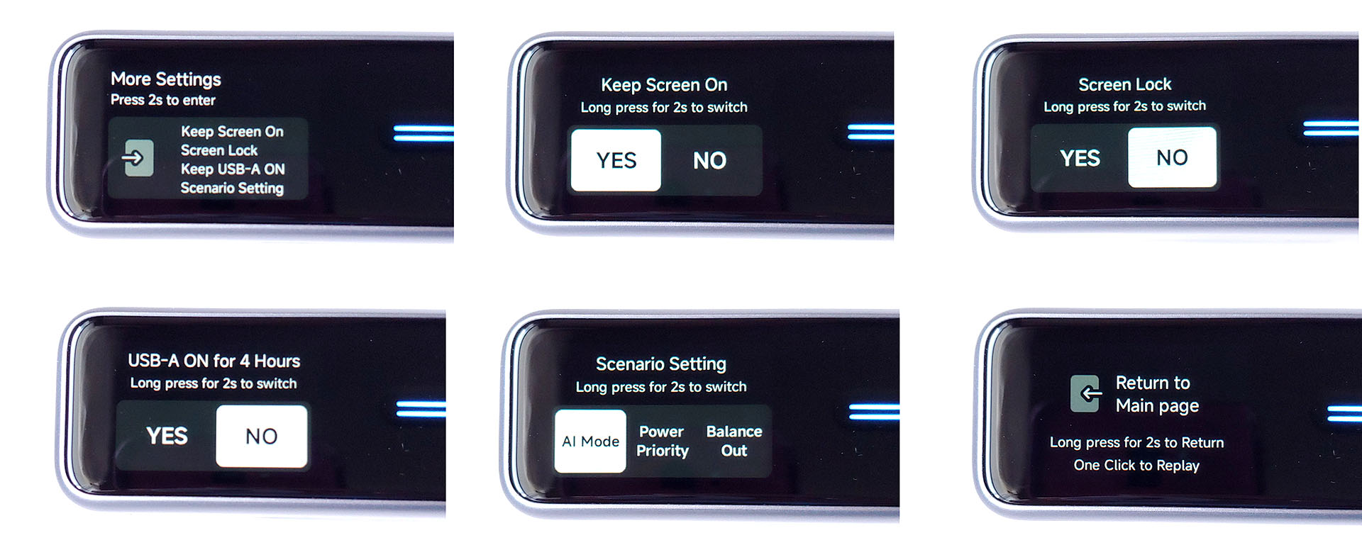 查看设置时,每按两秒可切换每个设置的状态。值得注意的主要设置是功率输出模式--人工智能、功率优先或平衡。