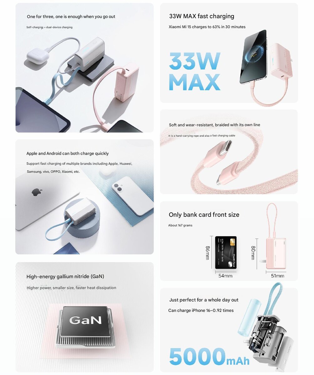 除了内置线缆,还有一个 USB-C 端口,两者的总功率输出为 33W。不过,Cuktech 指出,只有兼容的小米手机才能充分利用 33W 的快速充电支持。其他手机的最大功率为 30W,该公司强调,它可以在 30 分钟内将 iPhone 16 Pro Max 的电量充至 56%。