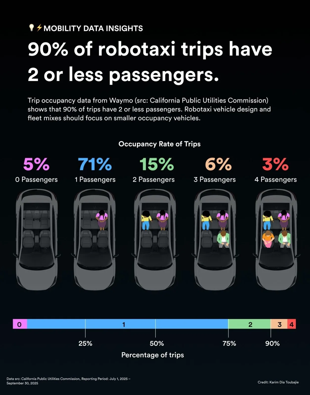 现在,关于 Waymo 上座率的最新统计数据证明了这一双座概念的正确性。事实证明,在无人驾驶的机器人出租车中,90%的行程都是由一两个人完成的。其中绝大多数也只有一个人乘坐,只有 9% 的前排座椅上至少有一个人。