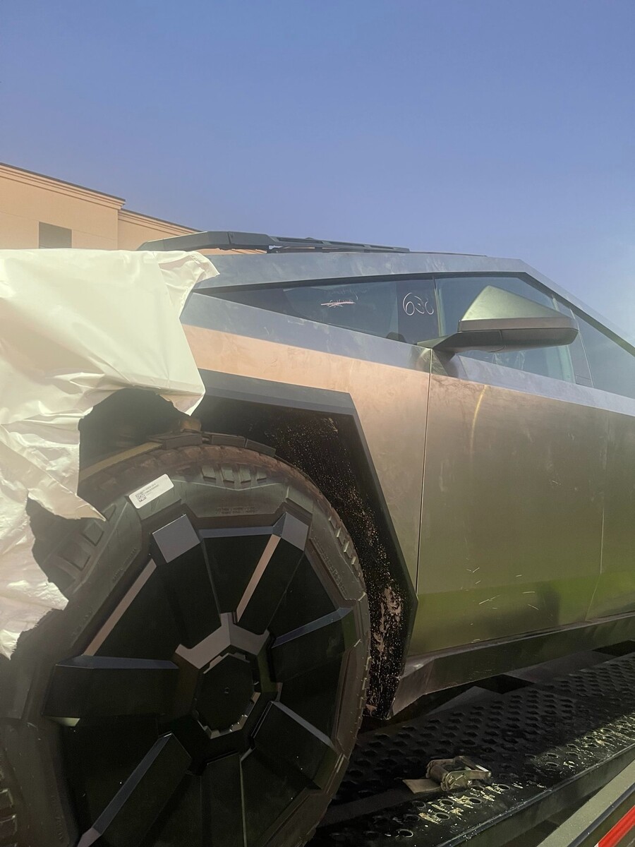特别是其中一辆赛博特卡车,车窗和前盖上都标有 "630 "字样,类似于接受碰撞测试的汽车。此外,在拖车上时,Cybertruck 受保护的底盘已被从下方拍下。