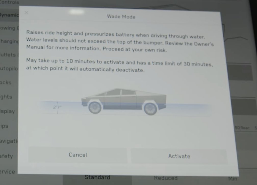 Cybertruck Wade 模式的水深为 32 英寸,小于 Rivian R1T 的 43 英寸,但大于陆地巡洋舰的 28 英寸,与福特 F-150 猛禽的额定水深差不多。特斯拉表示,用气罐压缩空气进行额外增压大约需要 10 分钟,此时韦德模式将完全激活,并持续长达 30 分钟,为 Cybertruck 驾驶员留下足够的时间穿越广阔的盆地。