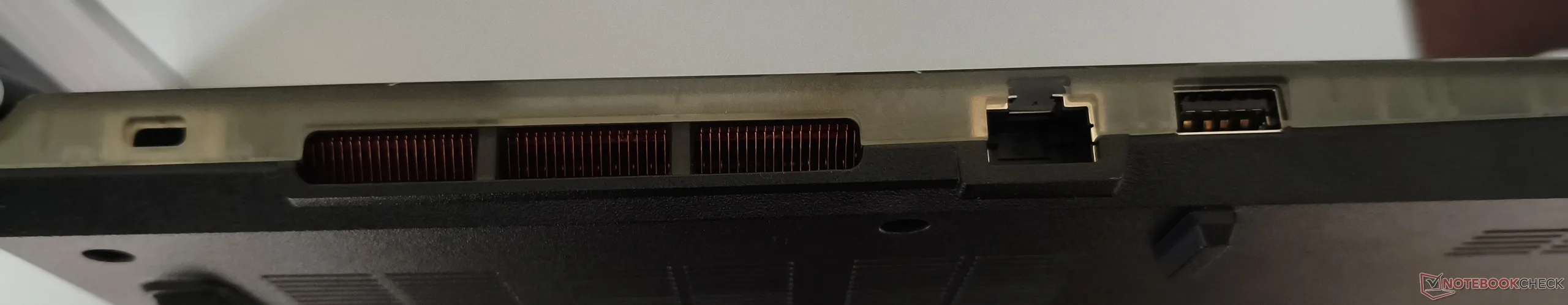 端口的选择并不特别丰富。三个 USB 端口感觉相当有限,尤其是微星省略了 USB 4 和 Thunderbolt 支持。好在可用的 USB-C 端口支持 Power Delivery 和 DisplayPort。外接显示器也可以通过 HDMI 直接连接。此外,还有一个音频插孔、一个 RJ45 端口和一个 Kensington 锁。