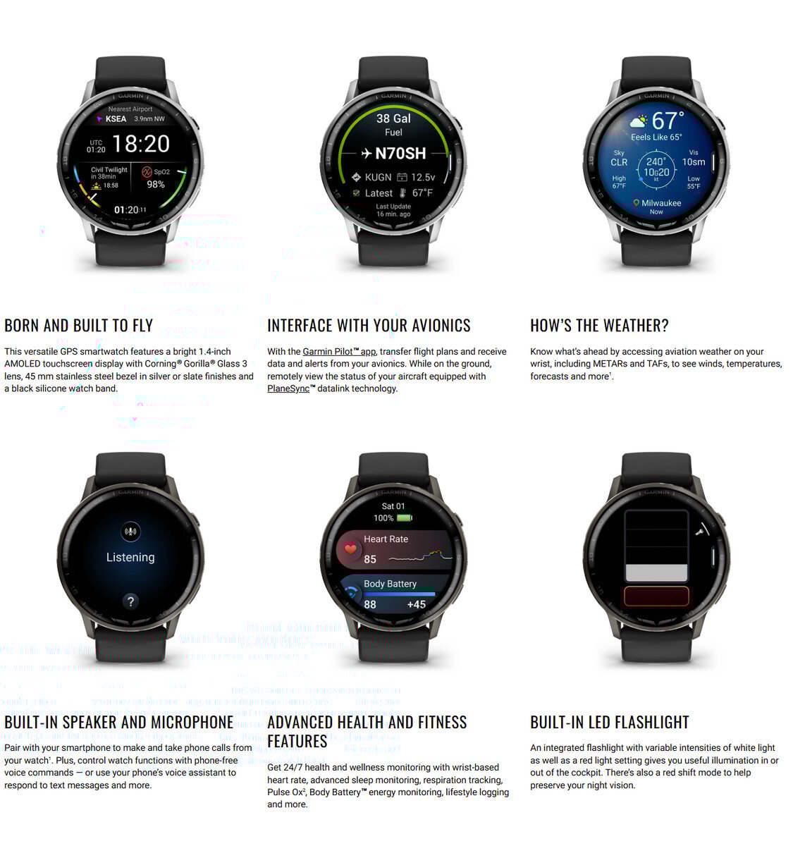 此外,D2 Air X15 还配备了内置 LED 手电筒和 Garmin Pilot 应用程序,后者可提供航空飞行数据、导航信息和航空晨报等飞行员关注的详细信息。此外,Garmin 还集成了其他 Venu 4 功能,如语音命令支持和 Messenger 应用服务。D2 Air X15 有石板色和银色两种外观,配黑色硅胶表带,售价 649.99 美元。请访问Garmin 网站了解更多详情。