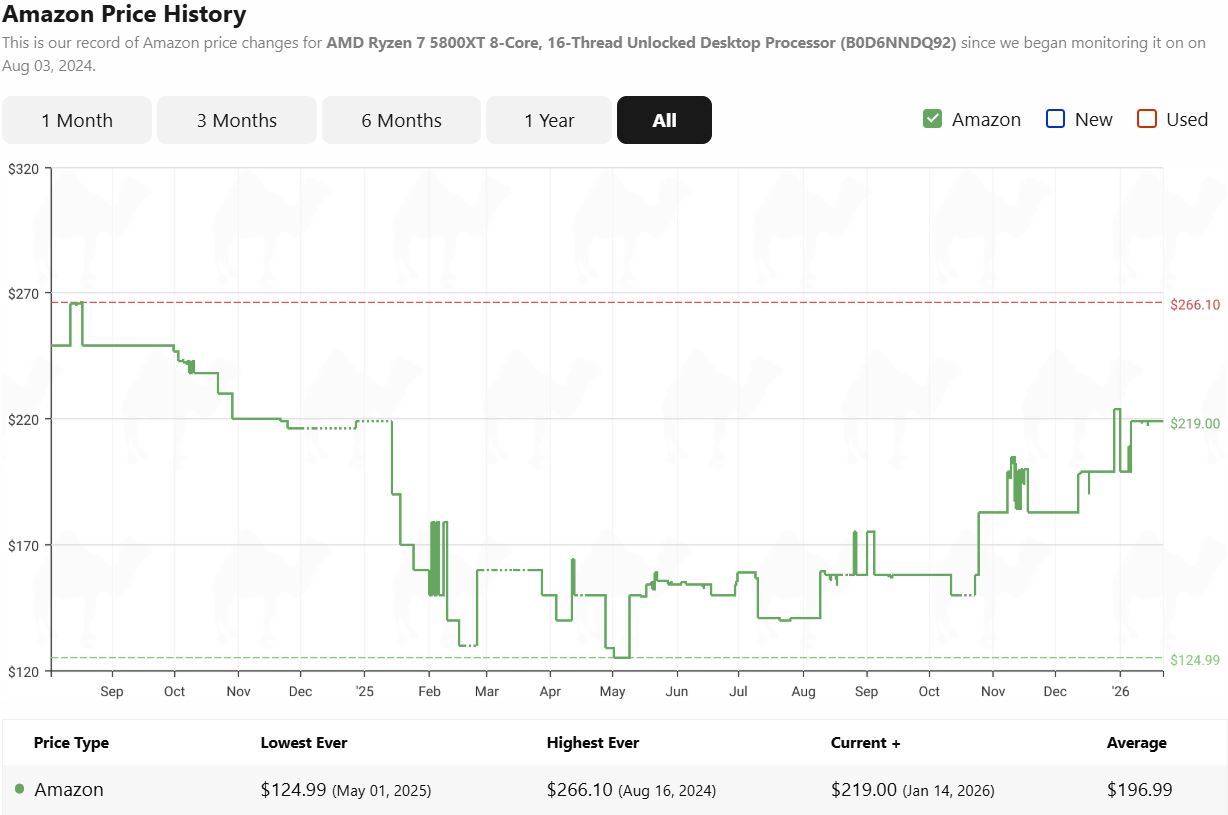 同样的情况也发生在 8 核 Ryzen 7 5800XT 上。这款 CPU 目前在亚马逊的售价为 219 美元。早在 2025 年 5 月,该处理器就曾创下 125 美元的历史最低价,因此目前的价格要高出 75% 以上。