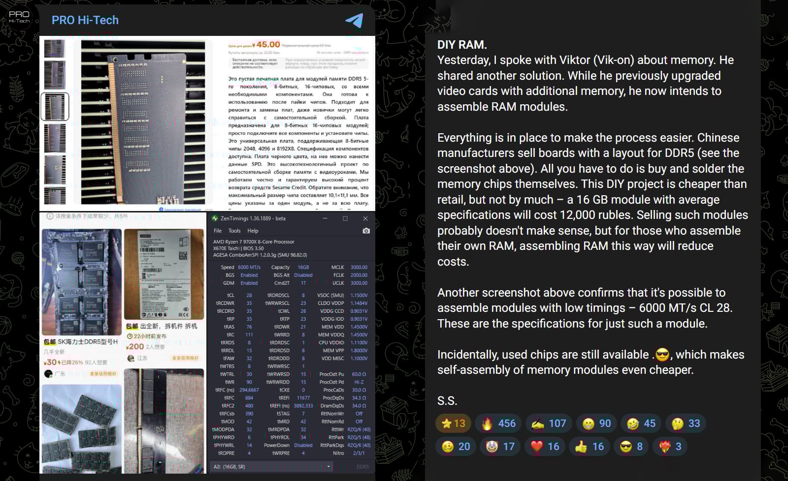 Pro Hi-Tech 强调指出,这些基本部件的采购并不困难。中国卖家已经开始提供可直接焊接的 DDR5 PCB 板。不过,这种 DIY 方式并不能为用户节省多少钱,至少在目前的状况下是这样。Pro Hi-Tech和Viktor "Vik-On "计算得出的估计数字显示,一根16GB内存条的价格约为12,000卢布,约合151美元。