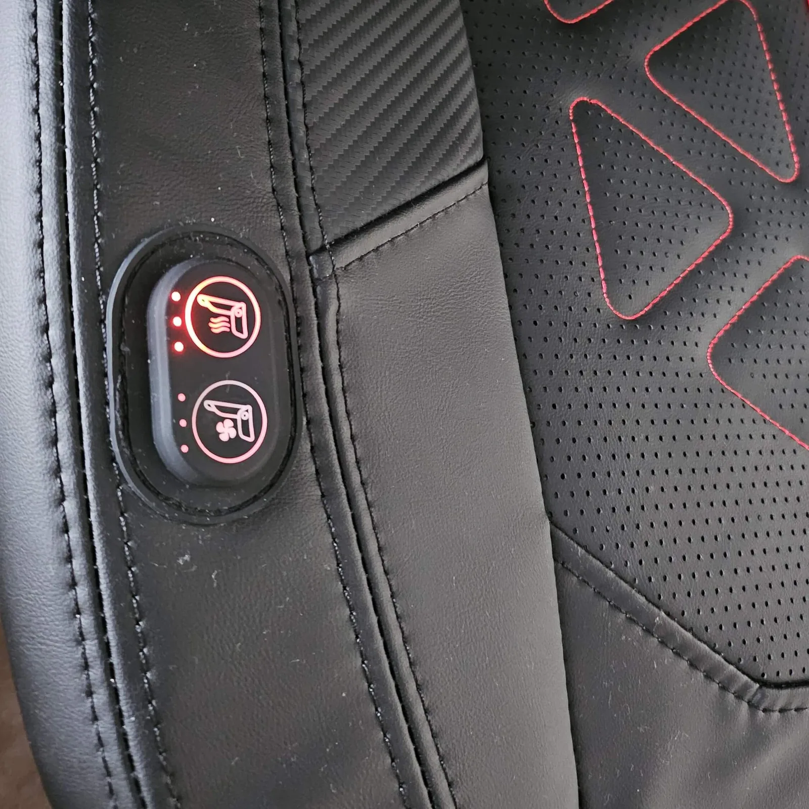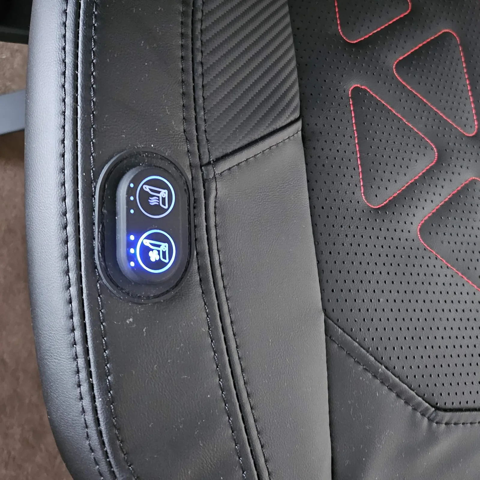 在测试过程中,我将之前的游戏椅 Noblechairs Epic 换成了火星专业版,并用它进行了两周的日常工作。由于夏季气温较高,我只对座椅加热功能进行了试用测试:几秒钟后座椅就热了起来,并可将温度调节为三档,最高可达非常热。座椅通风更适合这个季节。同样是三个档位,尽管室温为 28 度,但在第三个档位时,我的腿部感觉非常凉爽,因此我将它调到了第二个档位。不过,很高兴知道在必要时可以降温。按钮位于座椅外壳的右侧。我的身材一般偏瘦,但按钮仍然清晰可见,没有被遮挡。这意味着我还能看到我使用 1-2-3 红点或蓝点设置的功能,这是一个非常简洁的好办法。