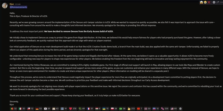 Hyungjun 'Kjun' Kim 在 Discord 上对有关 Denuvo 的批评发表了长篇回应。这位总监为在未通知玩家的情况下加入 DRM 向玩家道歉。虽然他没有确认 Denuvo 是否会在未来版本中回归,但它似乎不太可能在早期版本中再次出现。