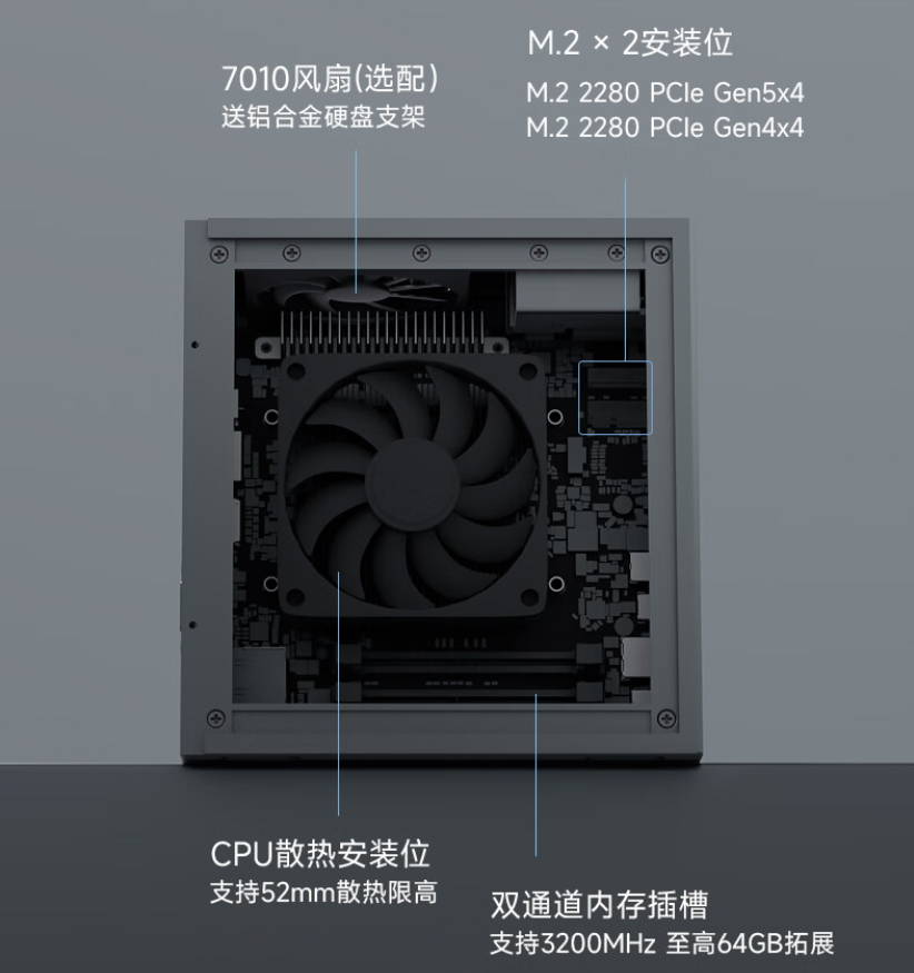 在散热方面,华擎 DeskMini B760 迷你电脑采用了桌面级散热平台。散热系统包括两个风扇,通过机箱提供被动散热。机箱由铝合金制成,采用双滑轨设计,便于拆卸。