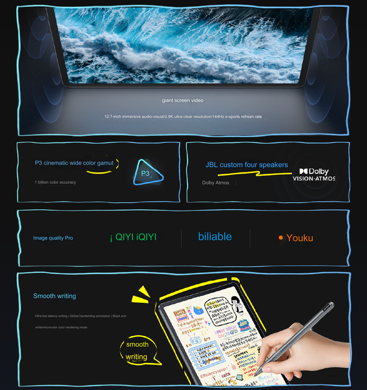 在正面,Android 平板电脑采用了一块 12.7 英寸的屏幕,分辨率为 2.9K,刷新率为 144 Hz,广DCI-P3 色域。.在音频方面,Android 平板电脑配备了定制的 JBL 四扬声器。联想表示,显示屏和扬声器系统能够提供身临其境的视听体验。