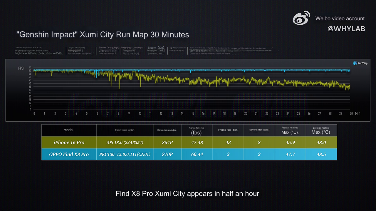 在 30 分钟的测试中,Oppo Find X8 Pro 的平均 FPS 为 60.44,而 iPhone 16 Pro 的平均 FPS 为 60.44。 iPhone 16 Pro的平均 FPS 为 47.48。对比图还显示,Dimensity 9400 手机在整个运行过程中都能提供相当流畅的体验,而 A18 Pro 设备则偶尔会出现许多卡顿。