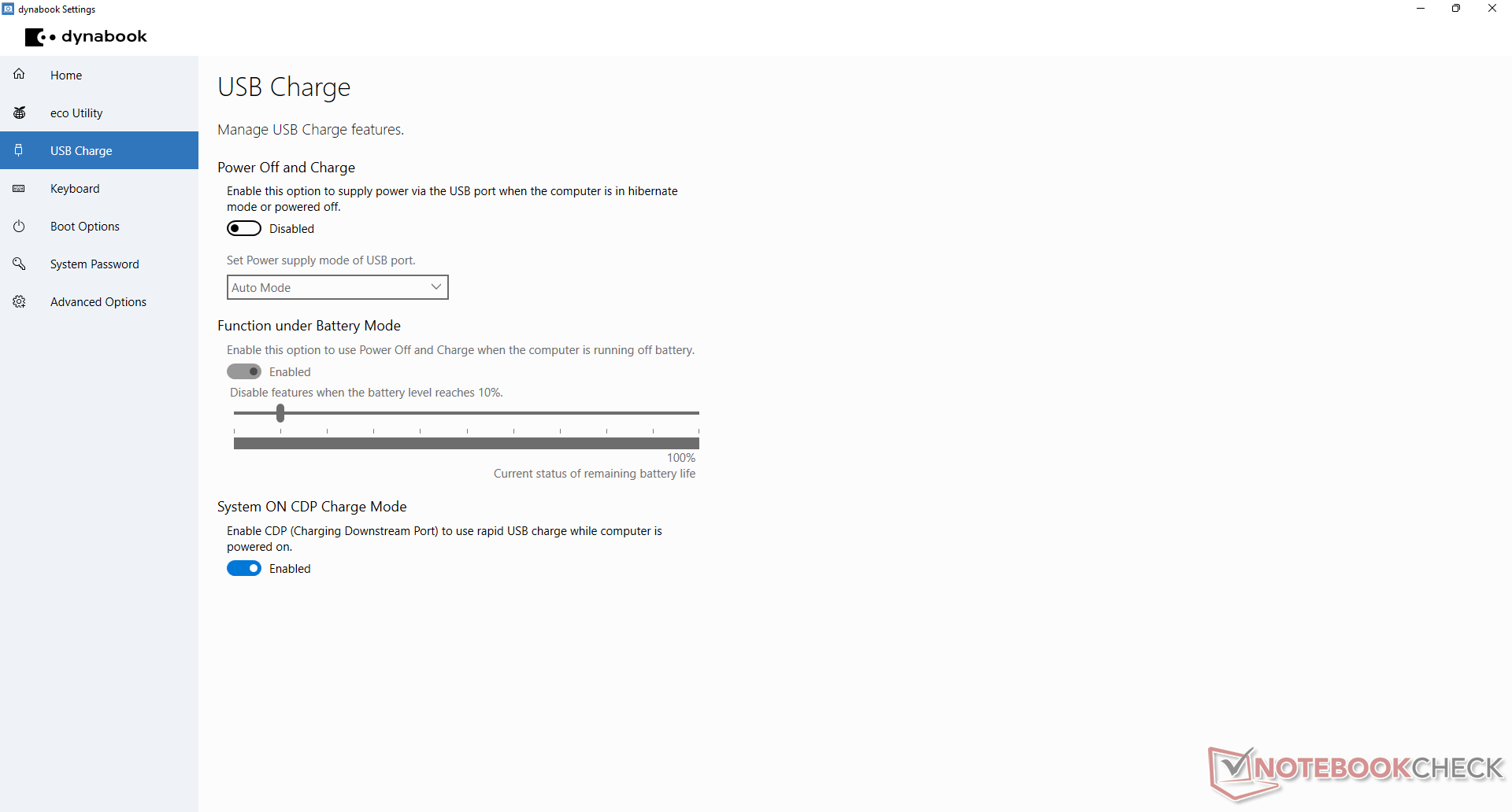 桌面上的空转消耗5瓦至9瓦,取决于亮度水平和电源配置文件设置。游戏需要40瓦至52瓦,而大多数其他超极本在运行旧的第11代酷睿U系列CPU时的功耗为30瓦。Dynabook的功耗较高,是由于其更强大,因此对Core-P CPU的要求更高。