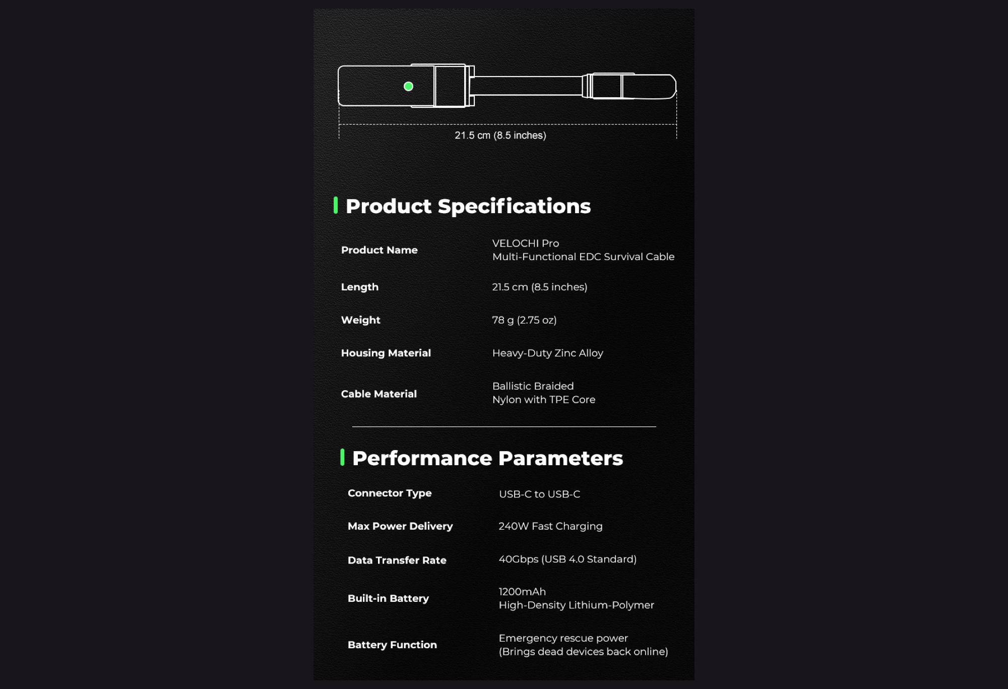 Velochi Pro 的市场定位是技术爱好者的日常携带(EDC)小工具。许多 EDC 工具都将刀具、螺丝刀或开包器等工具组合在一起,而 Velochi Pro 的核心则是一条 USB-C 至 USB-C 连接线,数据传输速率高达 40 Gbit/s,并能以高达 240 瓦的功率为设备充电。因此,Velochi Pro 可以与高质量的 USB-4 电缆(亚马逊售价 19.99 美元)相媲美。