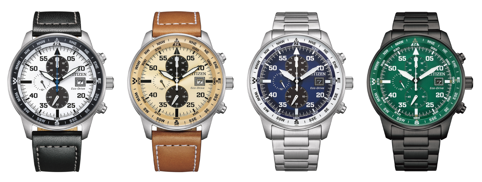所有这些 Citizen 手表都有一个装饰性指南针环和一个简单的日期指示器。共有三个表盘,其中一个以 24 小时格式显示时间,另一个则与计时功能相连。这些时计使用 Eco-Drive B612 机芯,可以用光驱动。此外,还具有电量不足警告和防止过度充电功能。