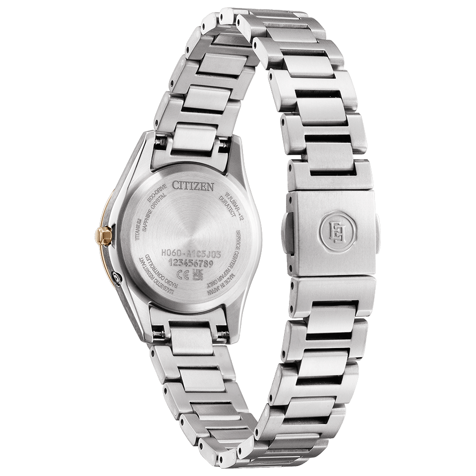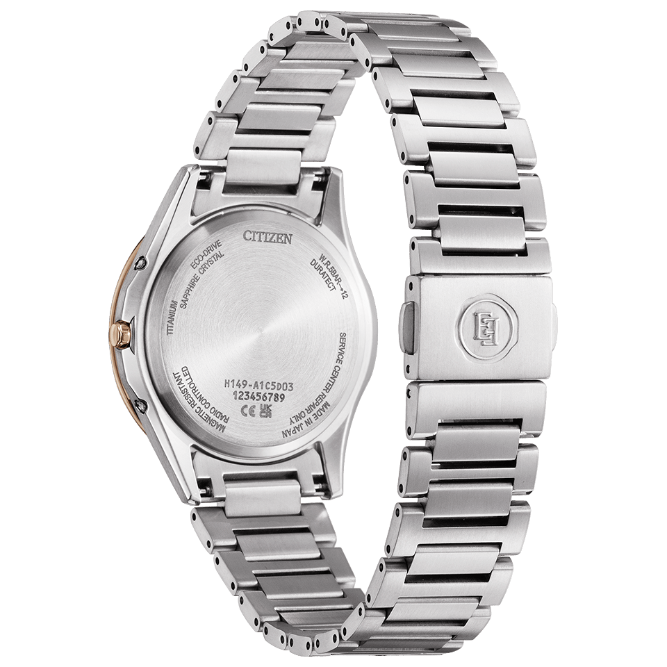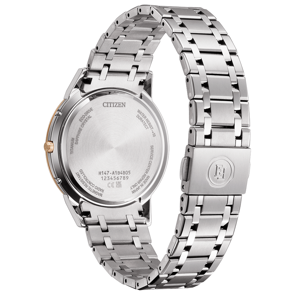 ES9375-51B 是三款腕表中较小的一款,宽 26.6 毫米,厚仅 7.7 毫米,重 34 克。它采用 H060 机芯,支持日本、中国、美国和欧洲的无线电接收。在没有接收到信号的情况下,精度为每月 ±15 秒。表壳和表链采用超级钛金属,表面经 Duratect Platinum 和 Duratect Sakura Pink 处理,使表圈呈现微妙的樱桃色调,与浅银色表身相得益彰。蓝宝石水晶表镜上覆有透明涂层,防水深度为 5 巴。定价为 132,000 日元(约合人民币 846 元)。