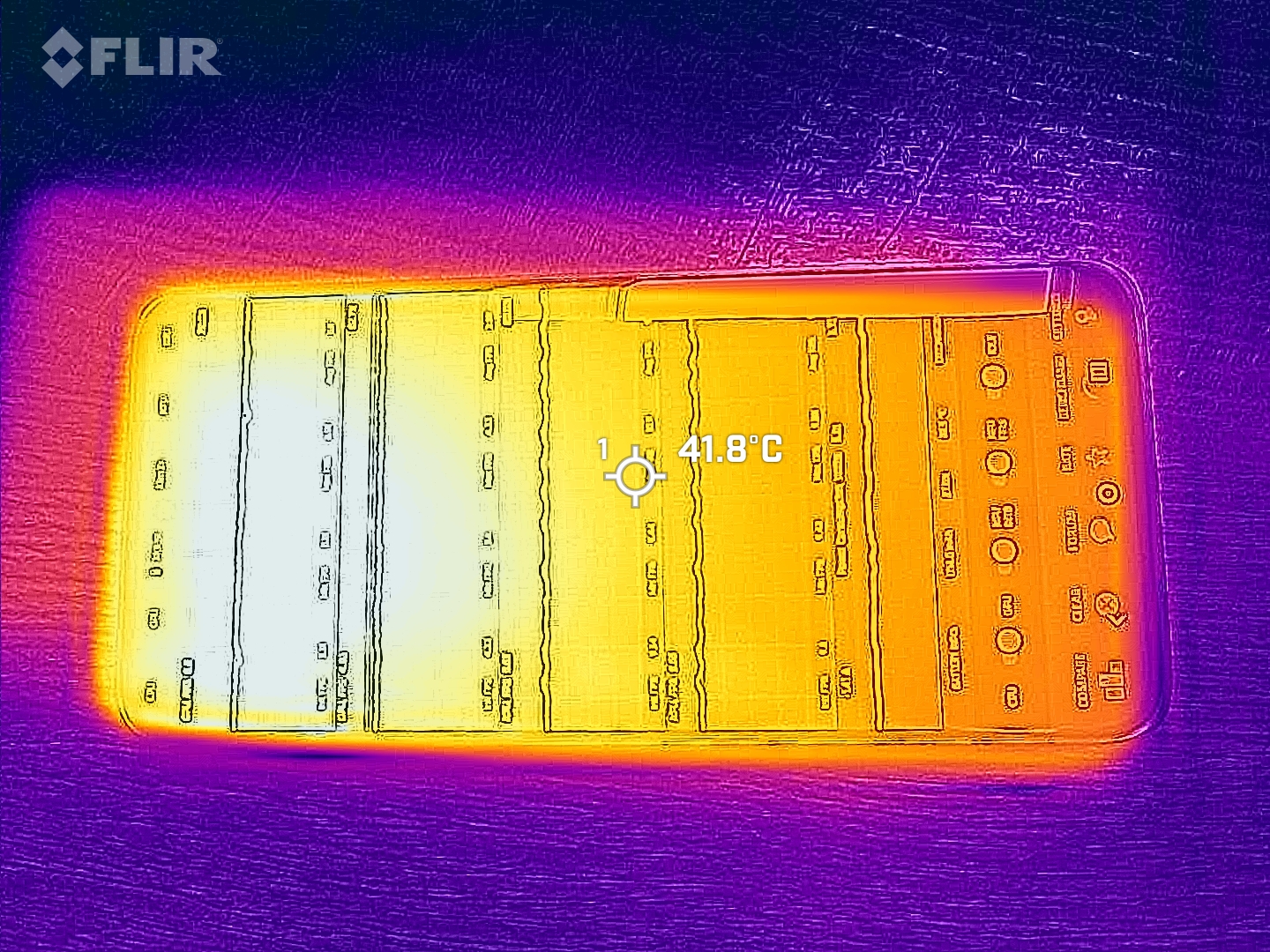 (+) In idle usage, the average temperature for the upper side is 24.8 °C / 77 F, compared to the device average of 32.9 °C / 91 F.